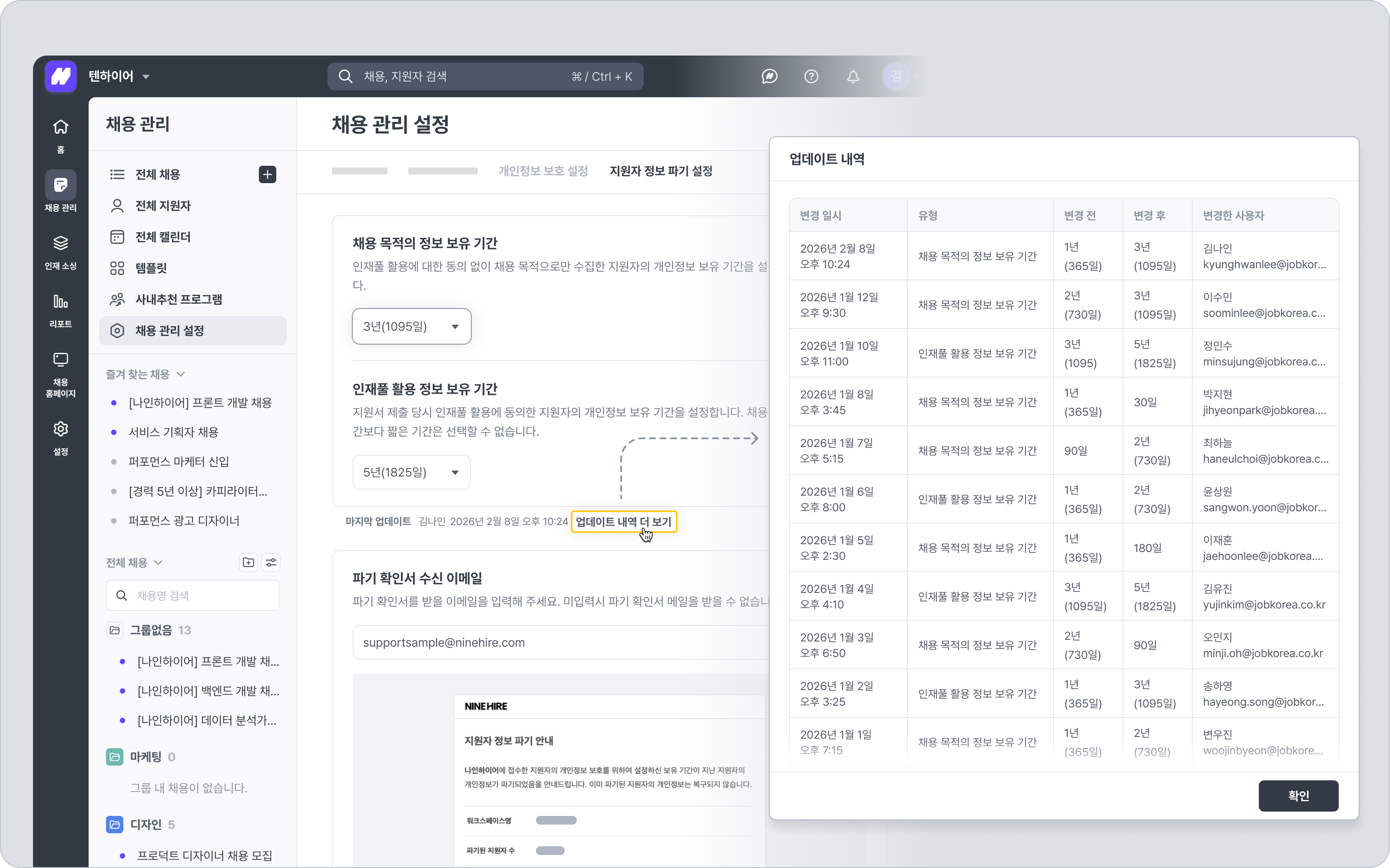 지원자 정보 보유 기간을 변경한 경우 [마지막 업데이트 정보] 및 [업데이트 내역 더 보기] 버튼이 표시됩니다.