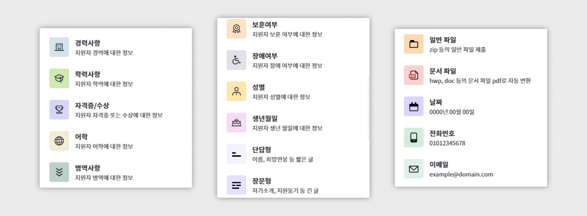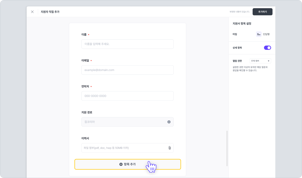 [지원자 직접 추가]에서 추가할 수 있는 항목은 아래와 같습니다.