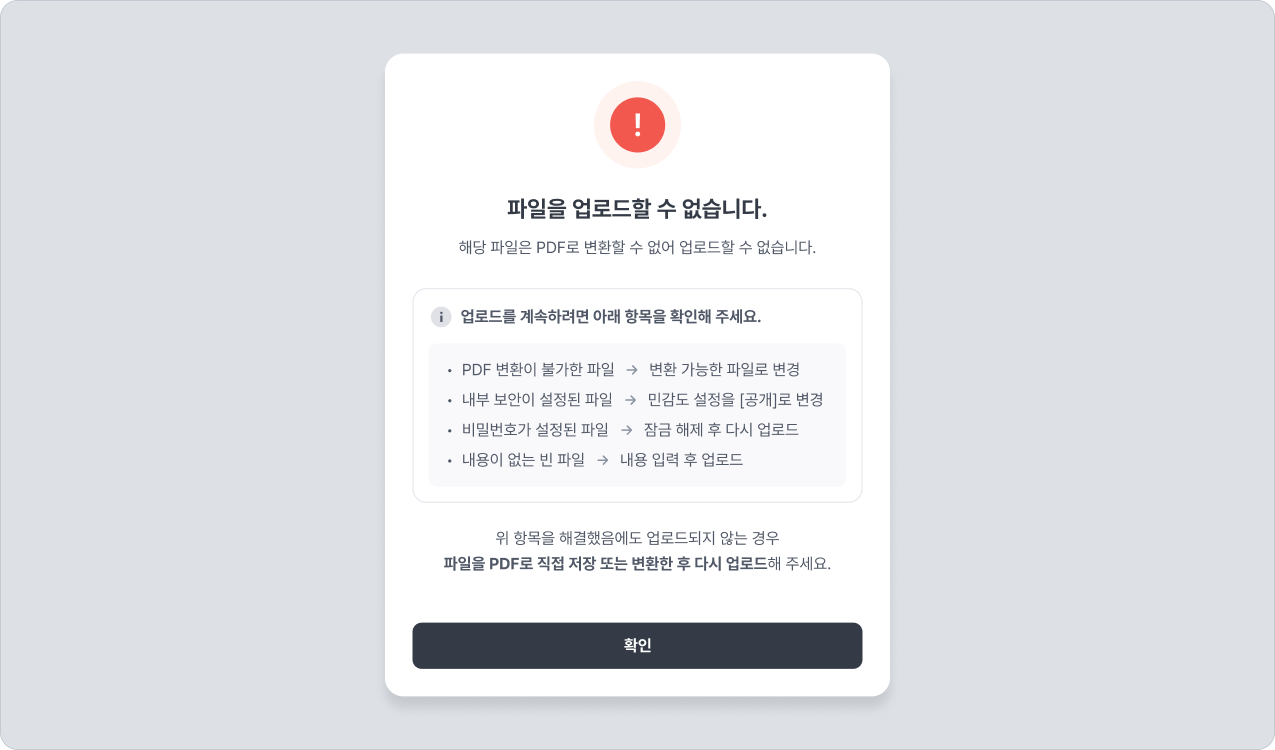 [문서 파일 업로드 불가 시 표시 되는 안내 모달]