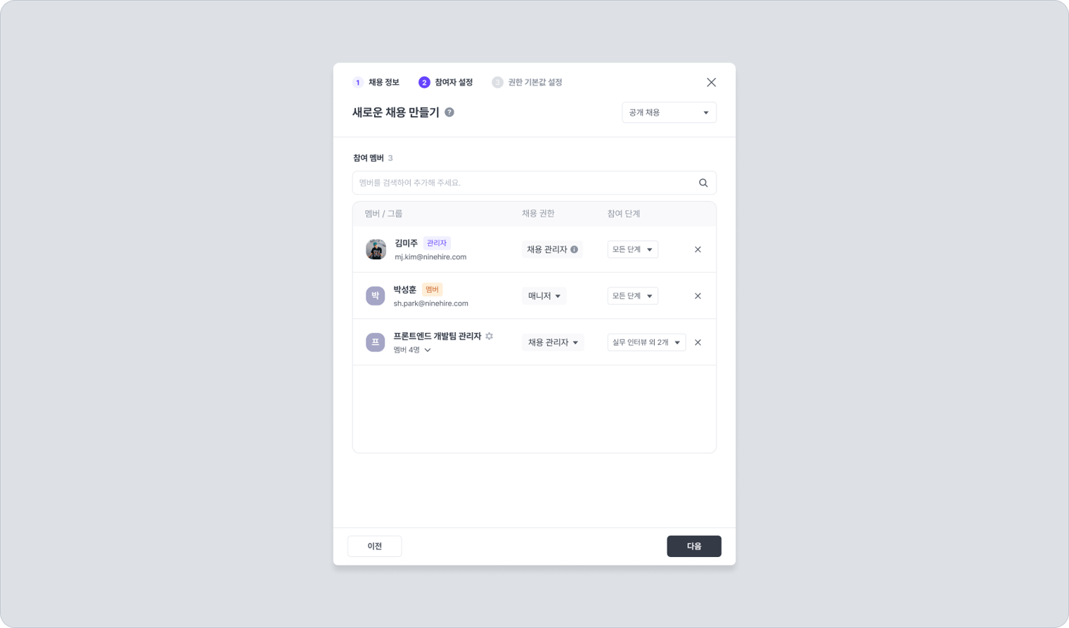 채용 만들기/복사 시 [참여자 설정] 단계에서 채용 참여 사용자를 추가할 때, 해당 사용자의 채용 권한을 설정할 수 있어요.