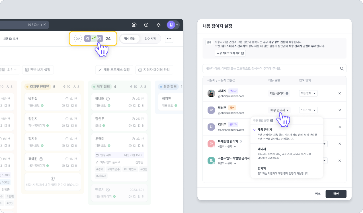 관리자는 워크스페이스 사용자를 채용 참여자로 지정하고, [평가자, 매니저, 채용 관리자] 중 하나의 권한을 부여할 수 있어요.