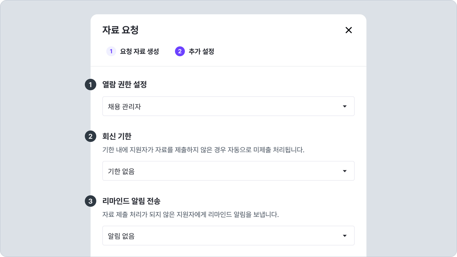 요청 자료의 열람 권한을 [전체 사용자, 매니저, 채용 관리자]로 차등 설정할 수 있어요.