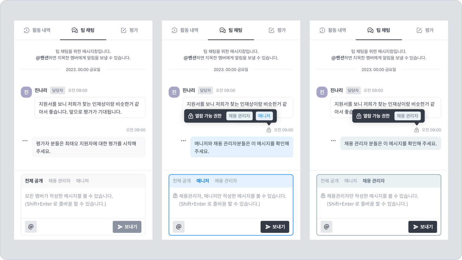 팀채팅은 건별로 열람 권한을 [전체 사용자, 매니저, 채용 관리자]로 차등 설정할 수 있어요.