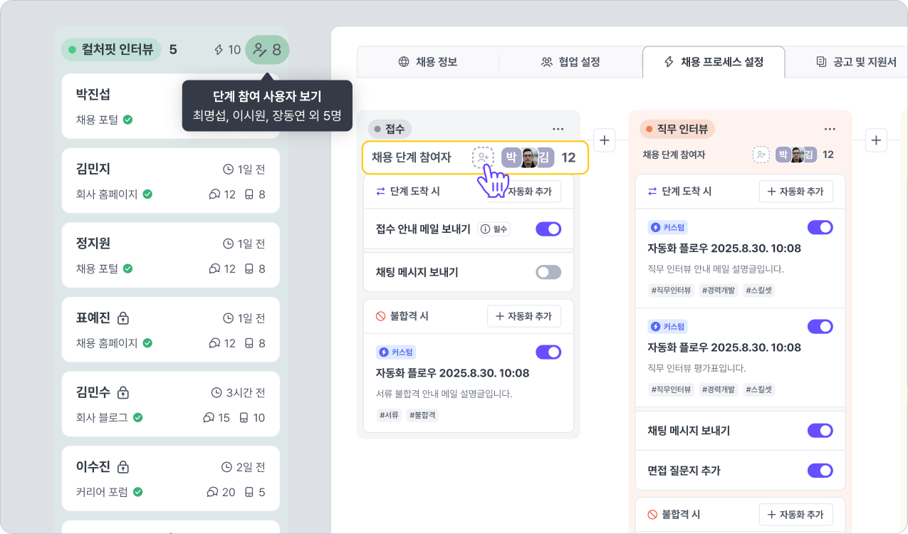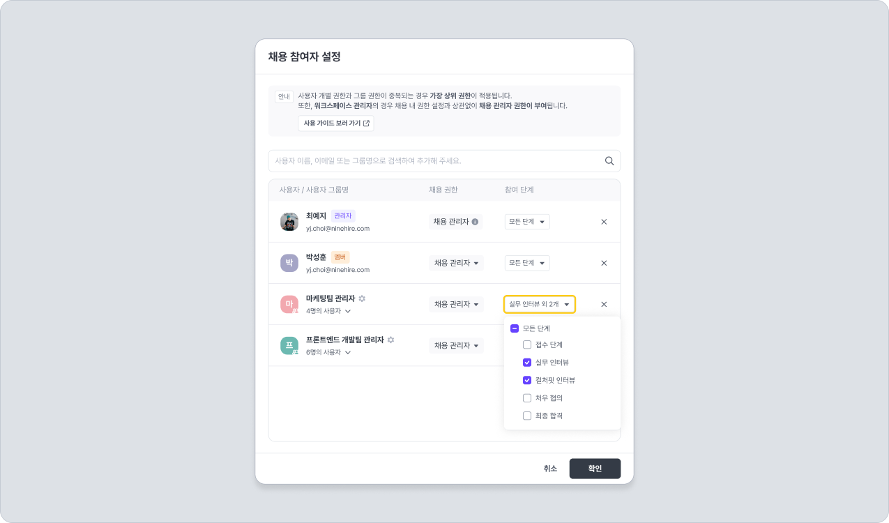 채용 단계 참여 설정을 활용하면, 채용의 특정 단계(과정)에서 지원자 정보를 확인하고 평가할 사용자와 그렇지 않은 사용자를 나누어 관리할 수 있어요.