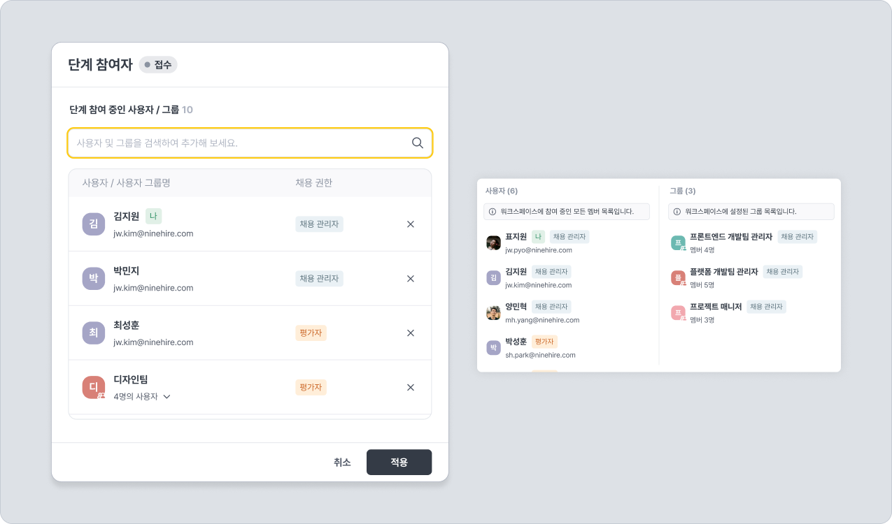 평가자나 매니저 권한을 가진 사용자가 활동해야 하는 범위 내에서만 단계 및 지원자 정보를 확인하고 평가에 참여하게 할 수 있어요.