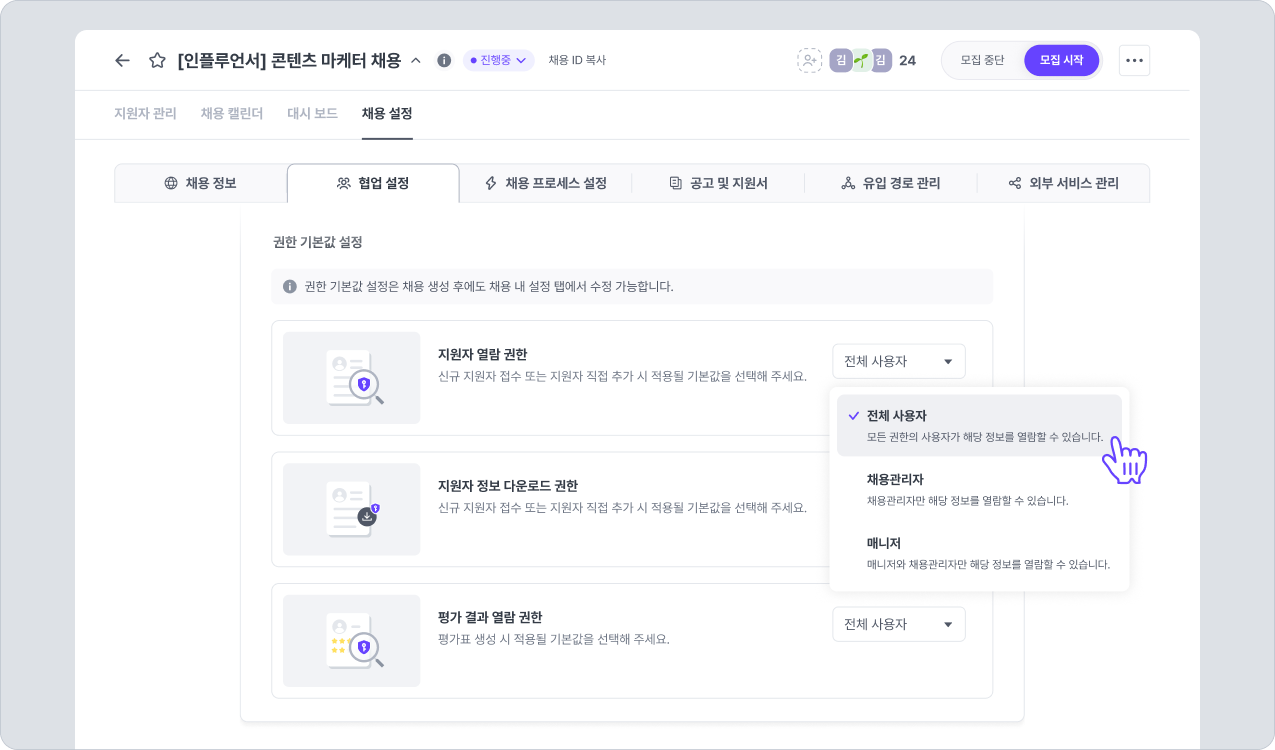 지원자 열람 권한은 이렇게 설정할 수 있어요.