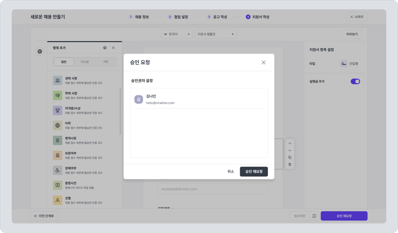 채용 만들기를 모두 마쳤다면 우측 하단의 [승인 요청] 버튼을 클릭합니다.