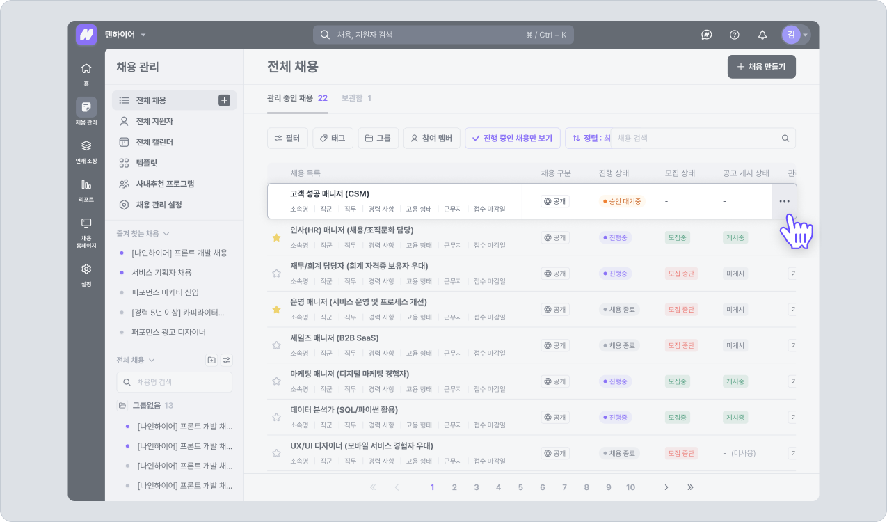 승인 대기 중인 채용 오른쪽의 더보기 […] 버튼을 클릭하여 승인을 요청한 채용을 삭제할 수 있습니다.