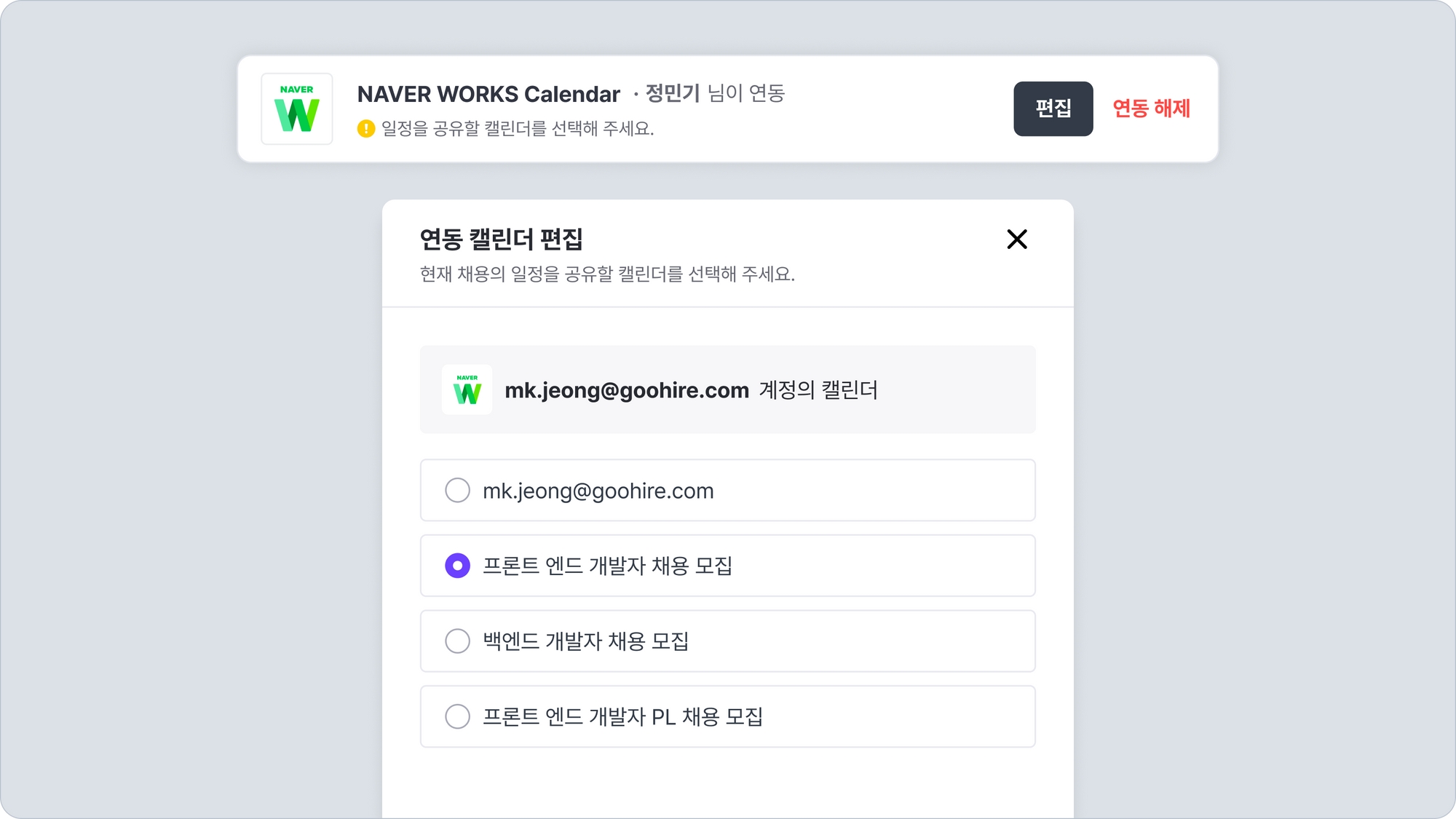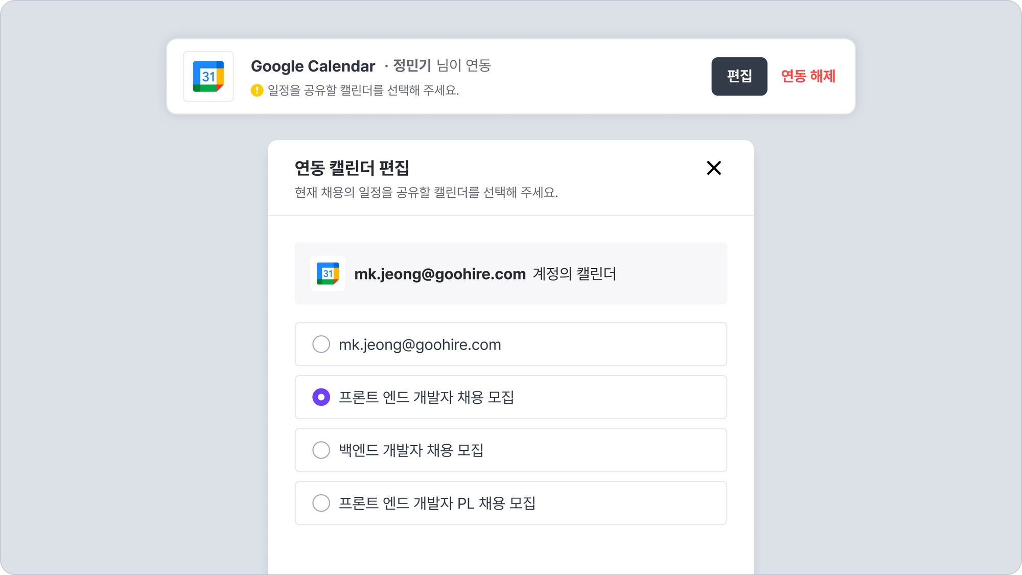 채용 캘린더와 외부 캘린더를 연동하면, 연동된 외부 캘린더에 해당 채용 일정이 모두 등록됩니다.