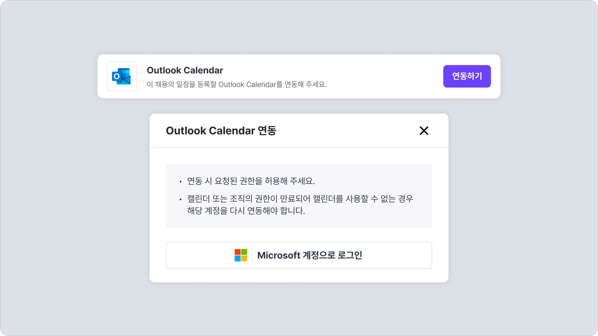 아웃룩 캘린더 항목의 연동하기 버튼을 클릭한 후 마이크로소프트 계정으로 로그인 버튼을 클릭하여 연동을 진행합니다.
