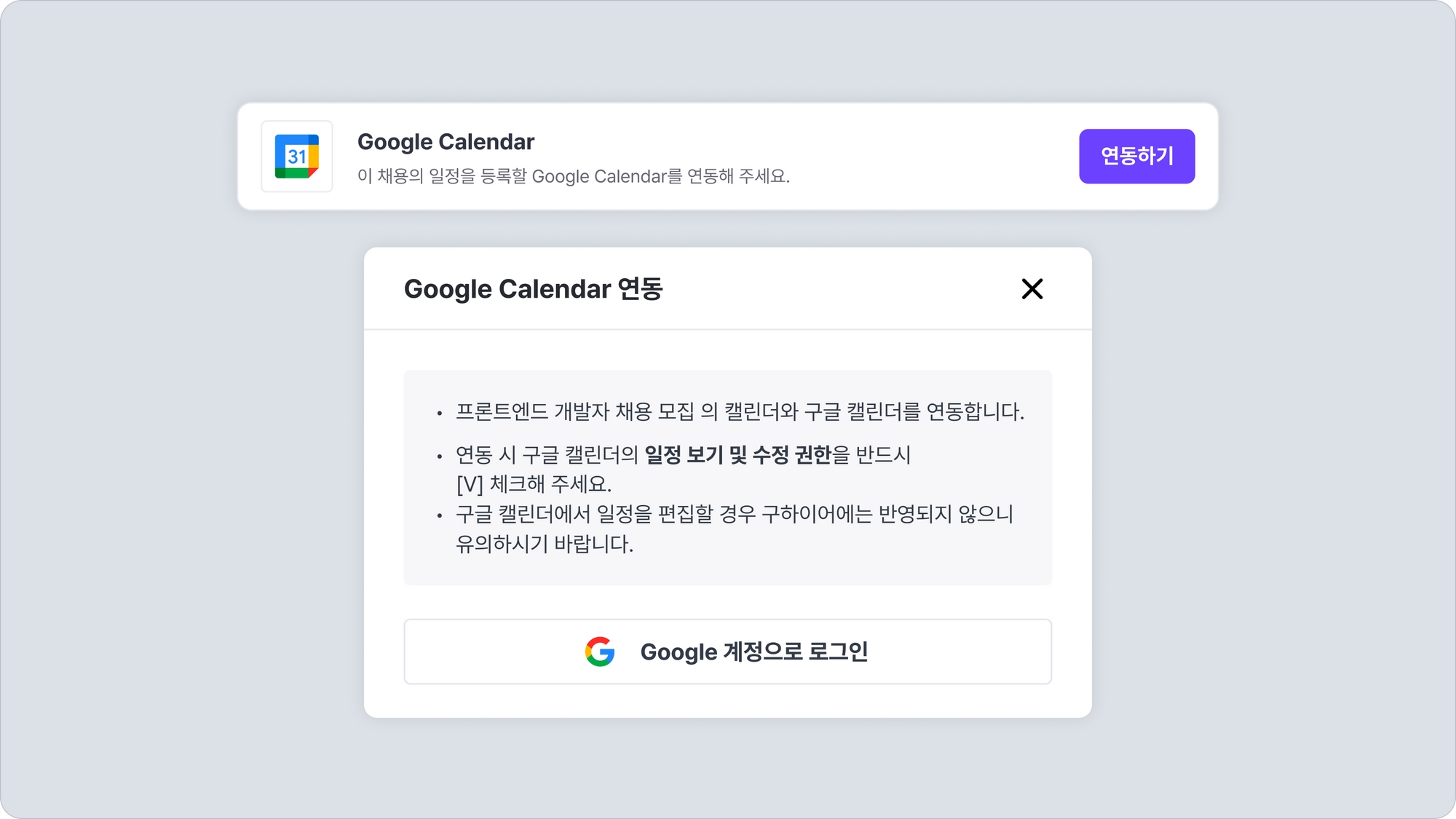 일정에 구글 캘린더 주최자가 설정되어 있는 경우, 채용 캘린더는 채용 참석자로 추가되어 일정을 연동합니다. 일정 수정을 통해 채용 캘린더 계정을 일정 참석자에서 제외하는 경우, 채용 캘린더에서는 해당 일정이 삭제되므로 주의해 주세요.