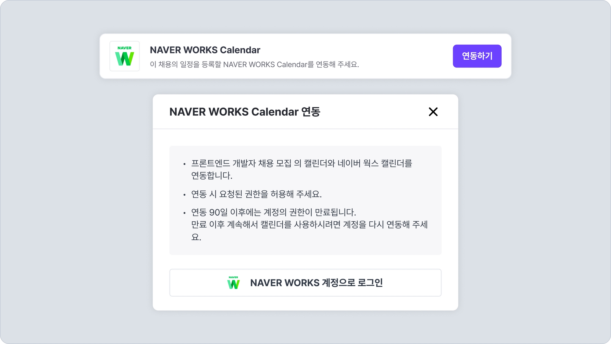 유저별 네이버 웍스 캘린더 연동을 위해서는 워크스페이스 설정 > 외부 서비스 설정 탭에서 최초 1회의 서비스 연동이 필요합니다. 해당 페이지에서의 연동 상태를 확인한 후 아래 연동을 진행해 주세요.