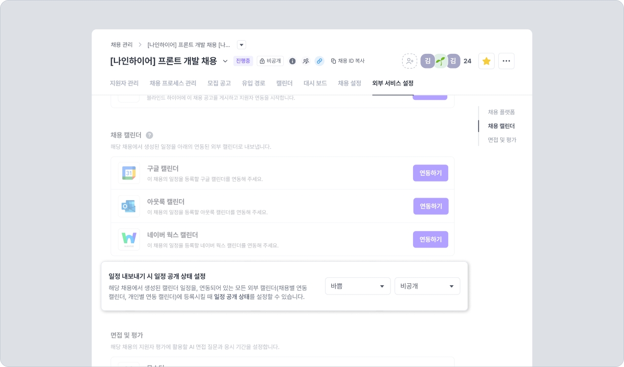해당 채용에서 확정되는 일정이 연동되어 있는 외부 캘린더(채용 일정 캘린더 연동, 개인 일정 캘린더 연동 모두)에 등록될 때 “일정 공개 상태”를 미리 설정해 둘 수 있습니다.