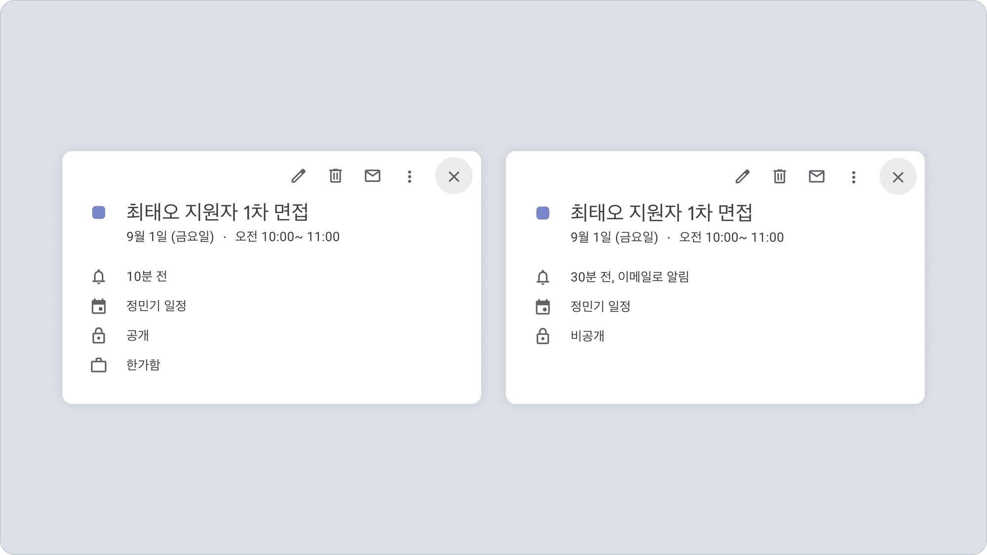 캘린더 일정 등록 설정에서 설정한 값은 일정 참석자(면접관)의 개인 캘린더와 채용 일정이 등록되는 캘린더 등에 모두 반영됩니다.