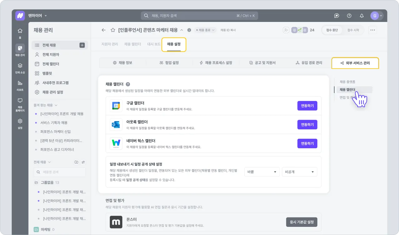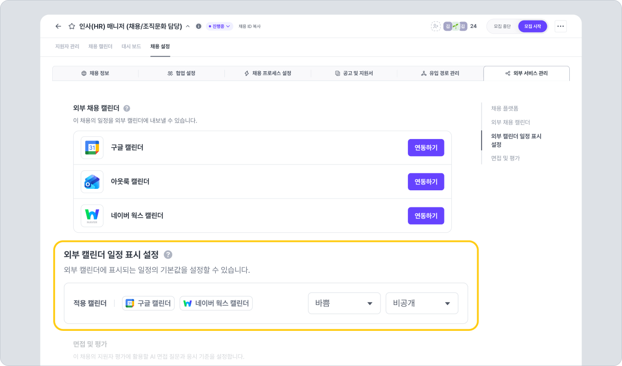 ■ 채용 캘린더 연동 경로: 채용 관리 > 개별 채용 > 채용 설정 > 외부 서비스 관리 > 채용 캘린더