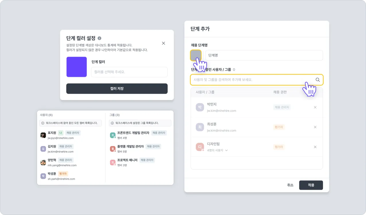 단계 추가 모달에서 단계명과 컬러, 단계 참여자를 설정할 수 있습니다.