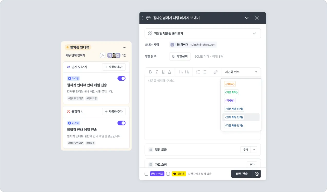 채용 단계 이름을 설정합니다. 여기서 설정한 단계명은 지원자에게 메시지/메일 전송 시 개인화 변수로(자동으로 단계 이름이 변경되도록) 활용될 수 있습니다. 그 예시는 아래 이미지와 같습니다.