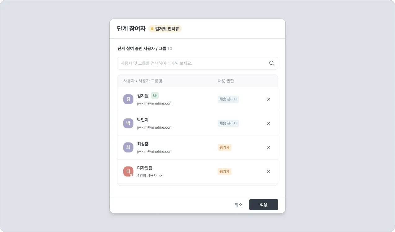 채용 단계 참여자/그룹 설정은 해당 단계의 열람 가능 여부에 영향을 줍니다. 평가자, 매니저 권한의 경우 단계 참여자로 설정되어 있어야 지원자 정보를 열람할 수 있습니다.