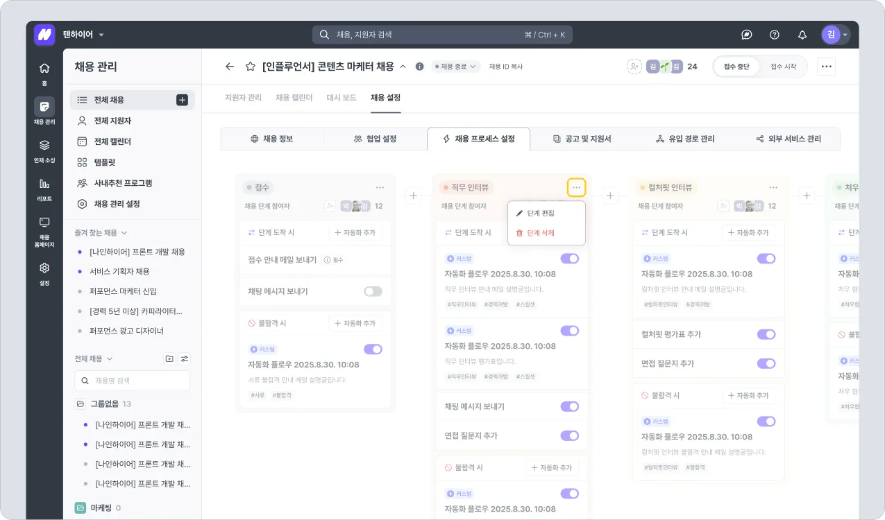 채용 단계를 추가하거나 편집, 삭제할 수 있습니다.