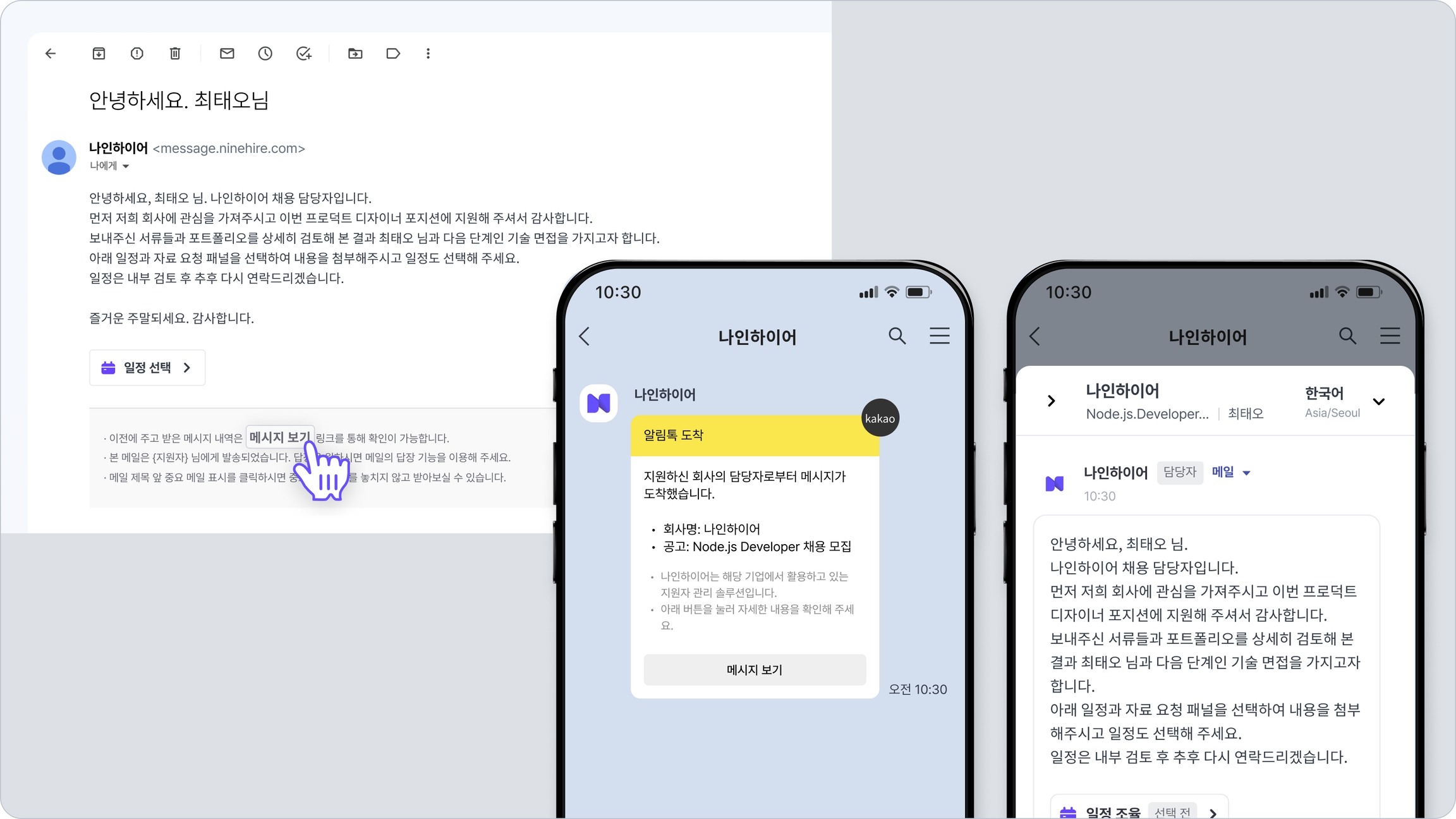 메시지 사용을 On으로 설정하면, 지원자가 수신하는 이메일이나 카카오 알림톡 하단에 [메시지 보기]라는 버튼이 노출됩니다. 그리고 지원자가 이 버튼을 클릭하면 1:1 메시지 창에서 채용 담당자와 주고 받은 연락 히스토리를 확인할 수 있습니다. 메시지 창에는 주고 받은 채팅 메시지와 메일이 모두 기록됩니다.