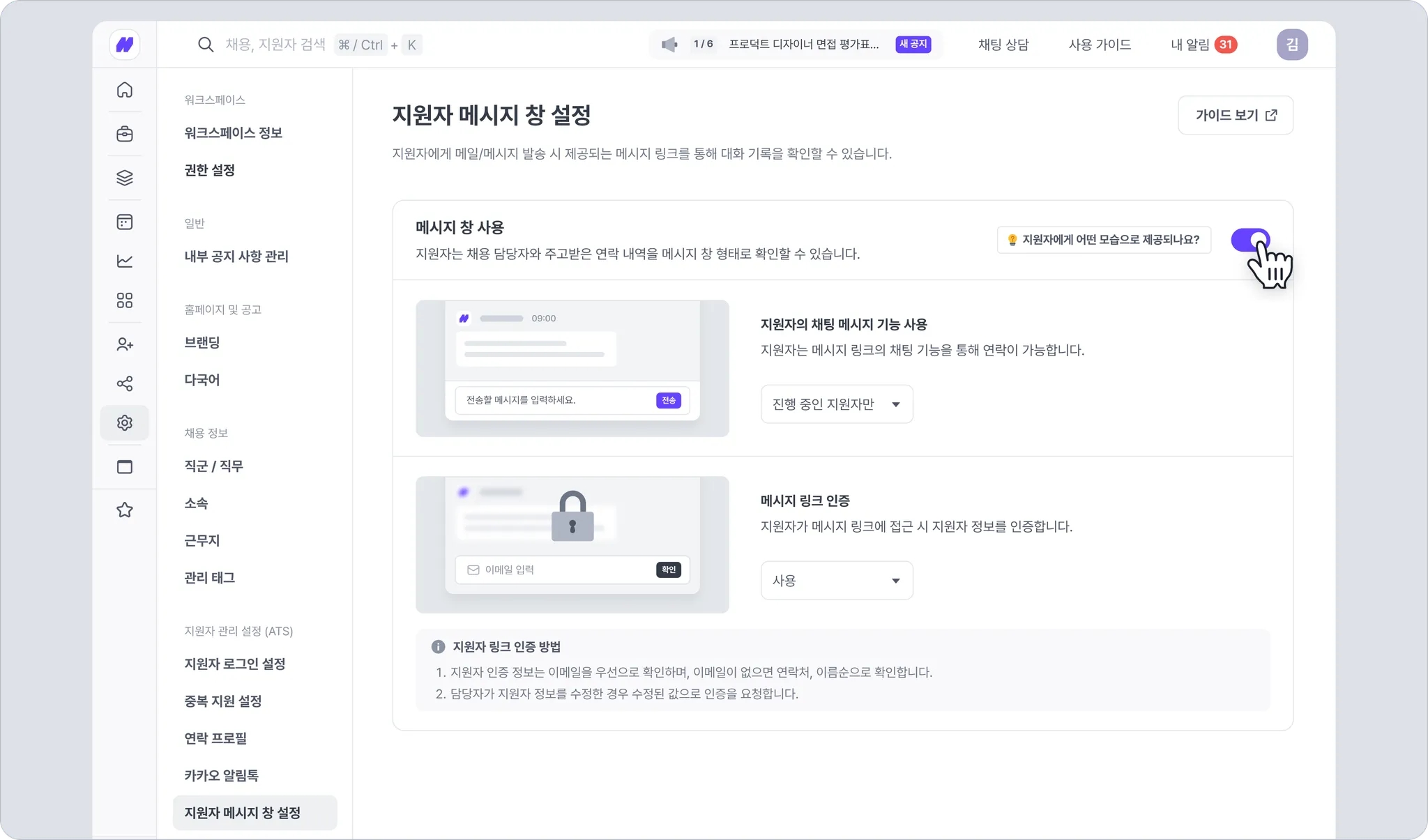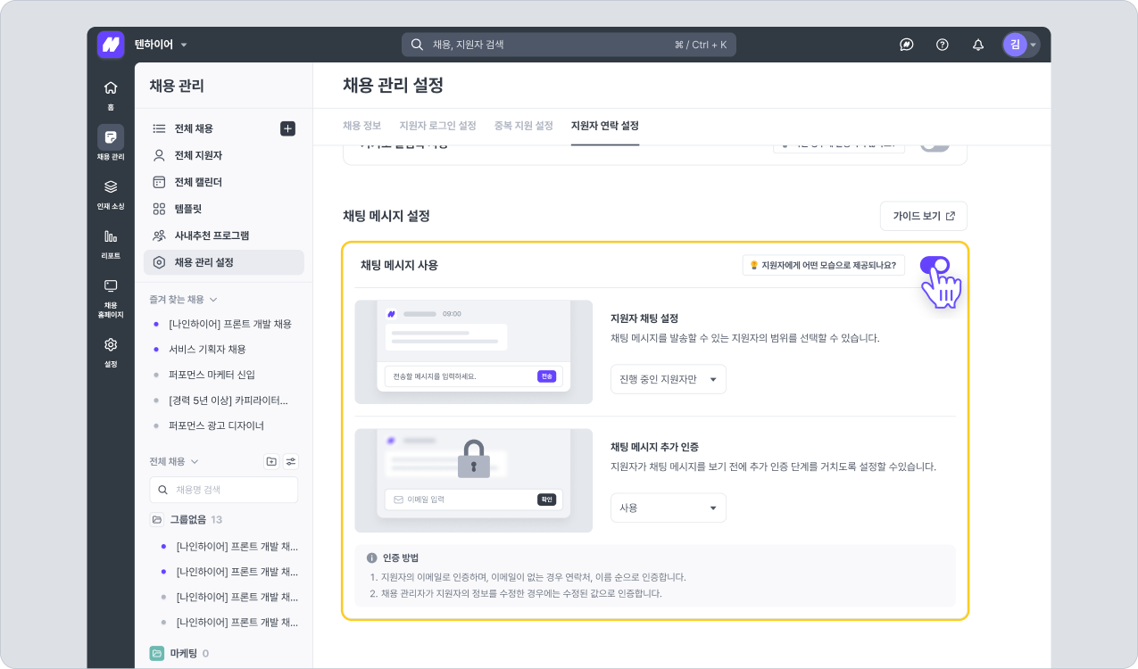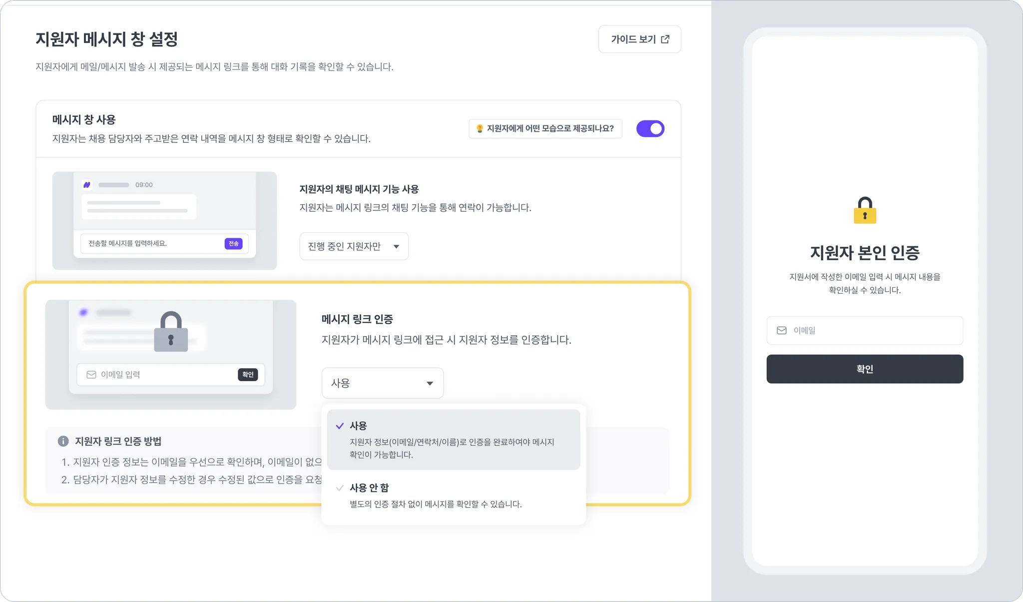 지원자가 메시지 창에 접근 시 지원자 본인 인증을 진행할 지 여부를 설정합니다.