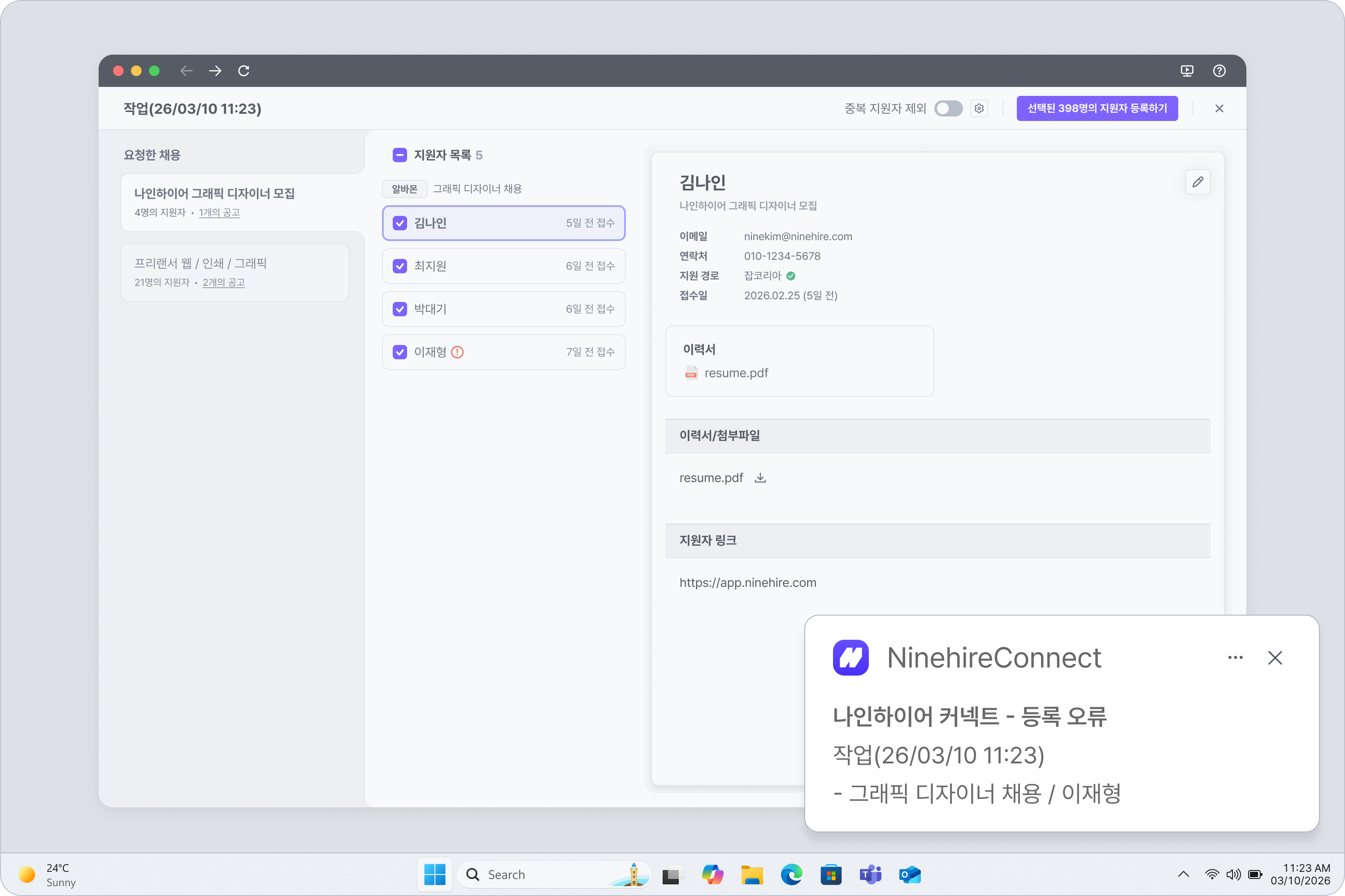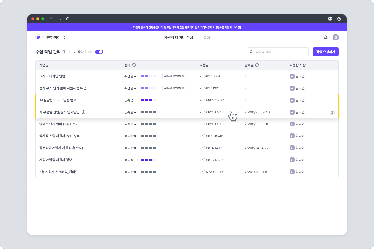 등록 중: 나인하이어 채용과 매칭하여 지원자를 등록하고 있는 상태입니다.
