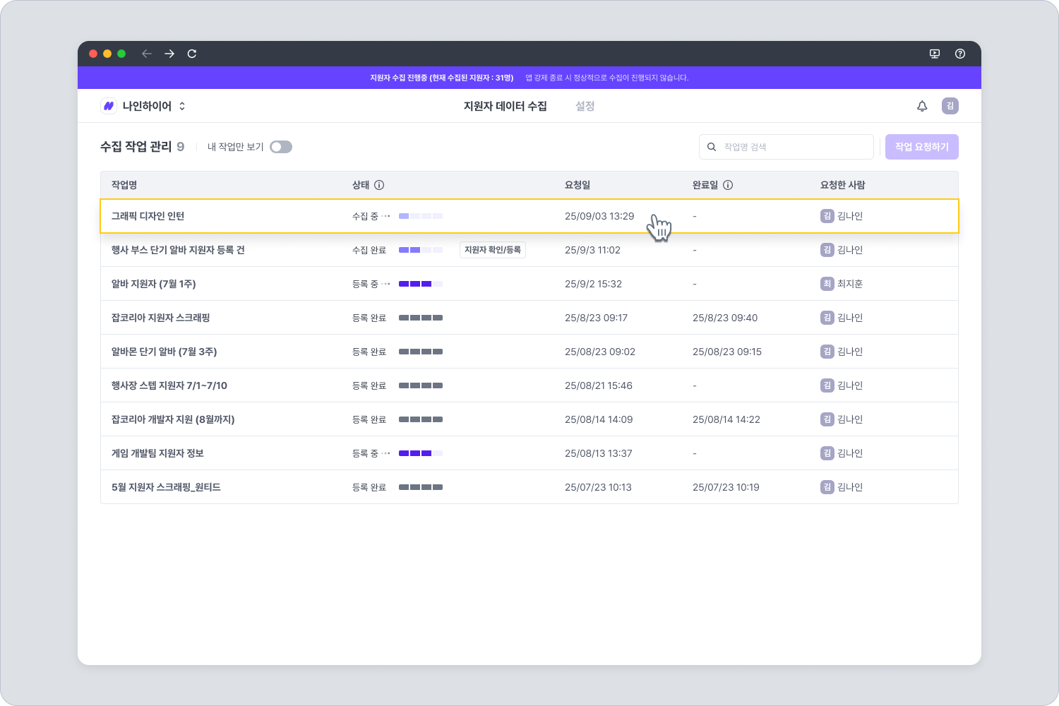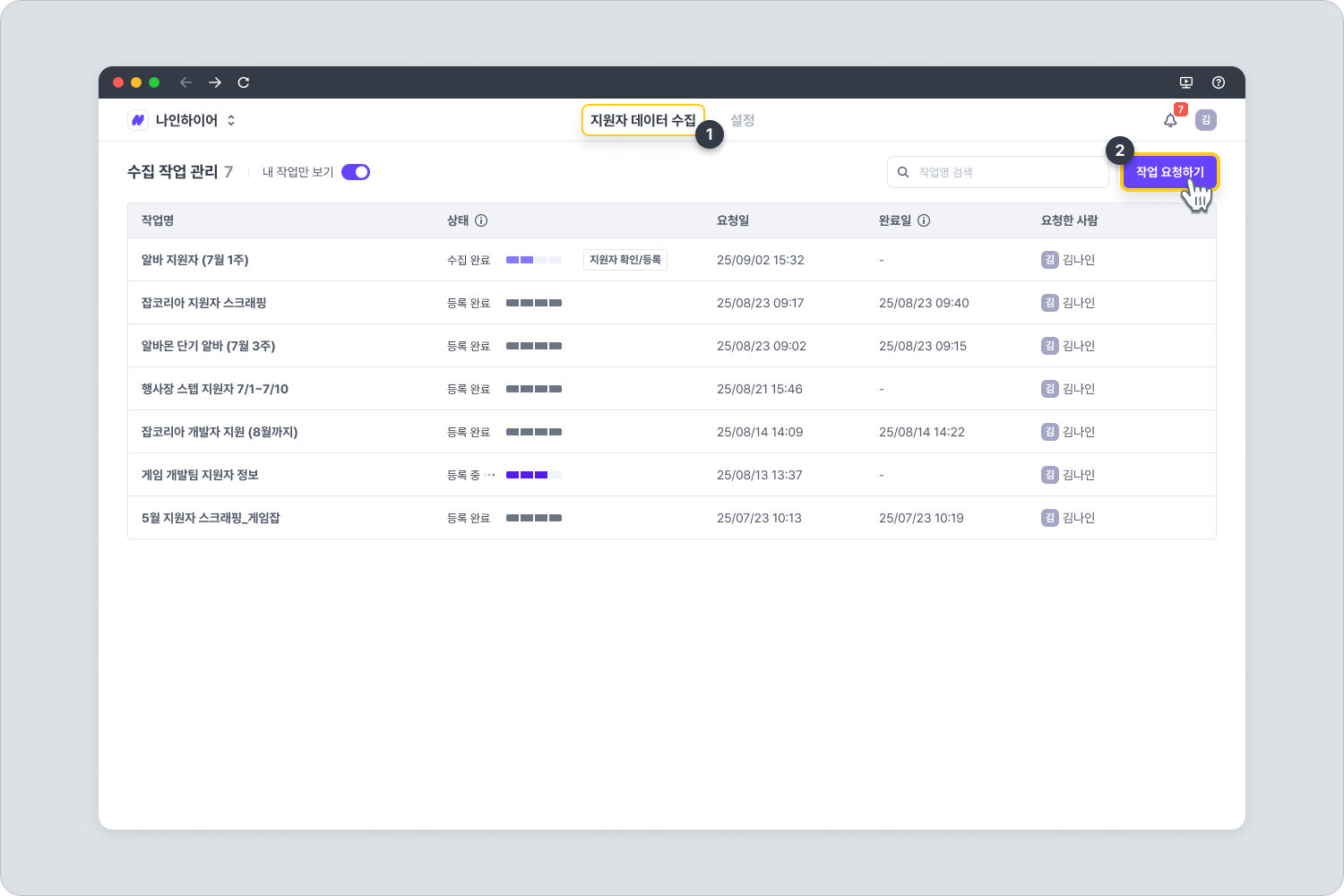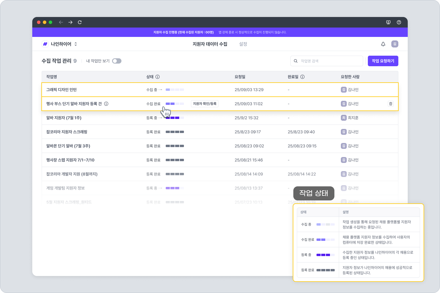 지원자 수집 작업 요청 경로: 지원자 데이터 수집 > 작업 요청하기