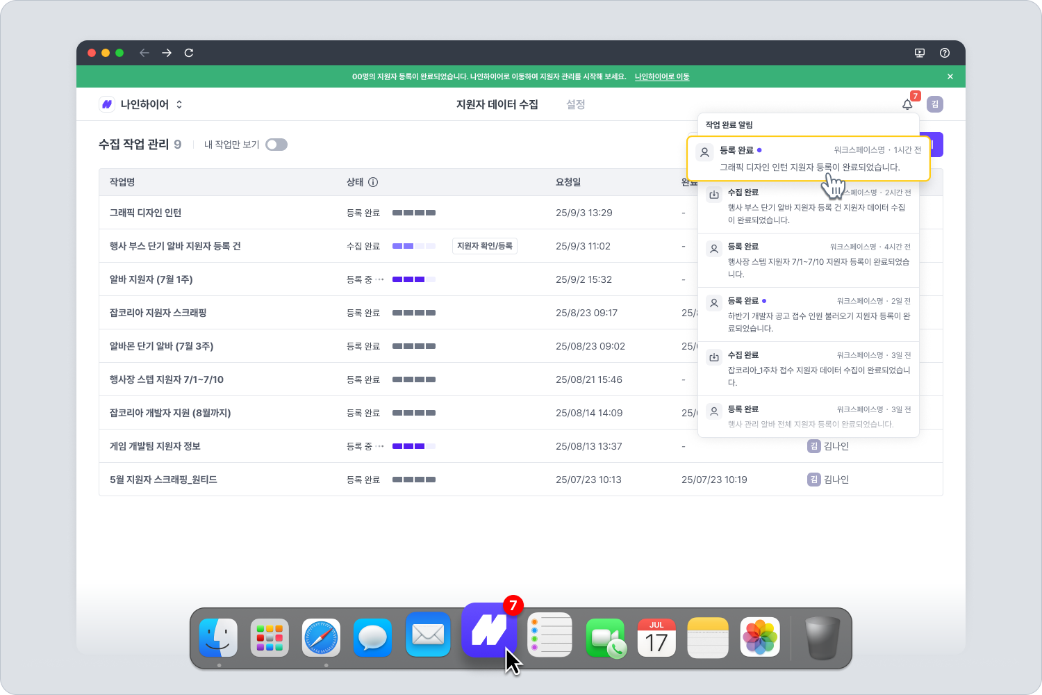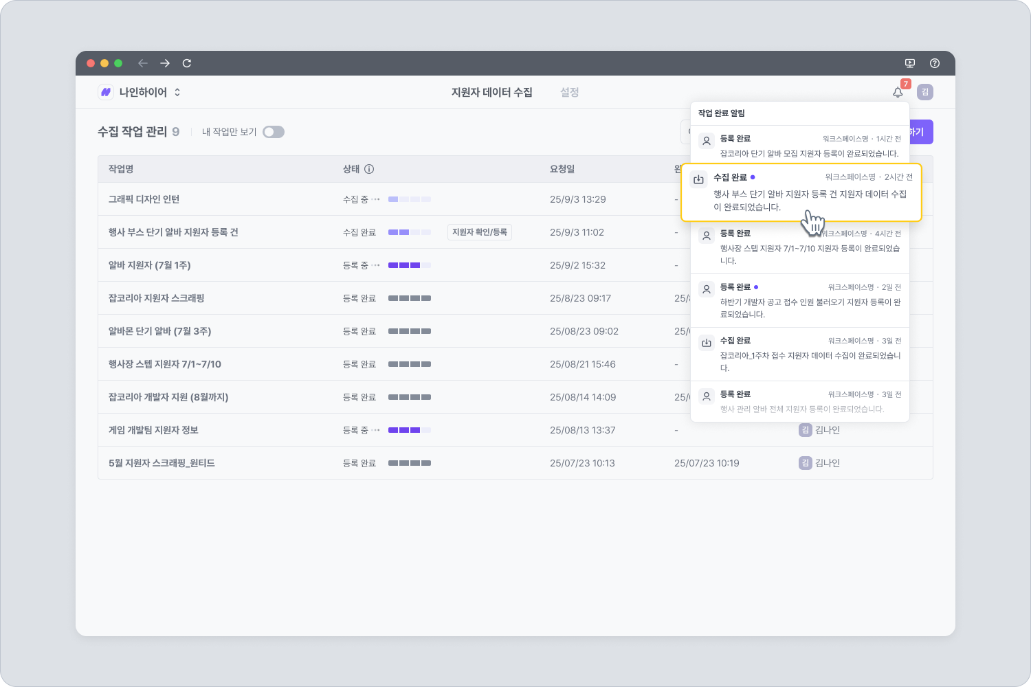 작업이 완료되어 지원자를 등록할 준비가 된다면 앱 푸시 알림 및 앱 내 알림(우측 상단 종 모양)을 통해 ”수집 완료” 알림을 확인할 수 있습니다.