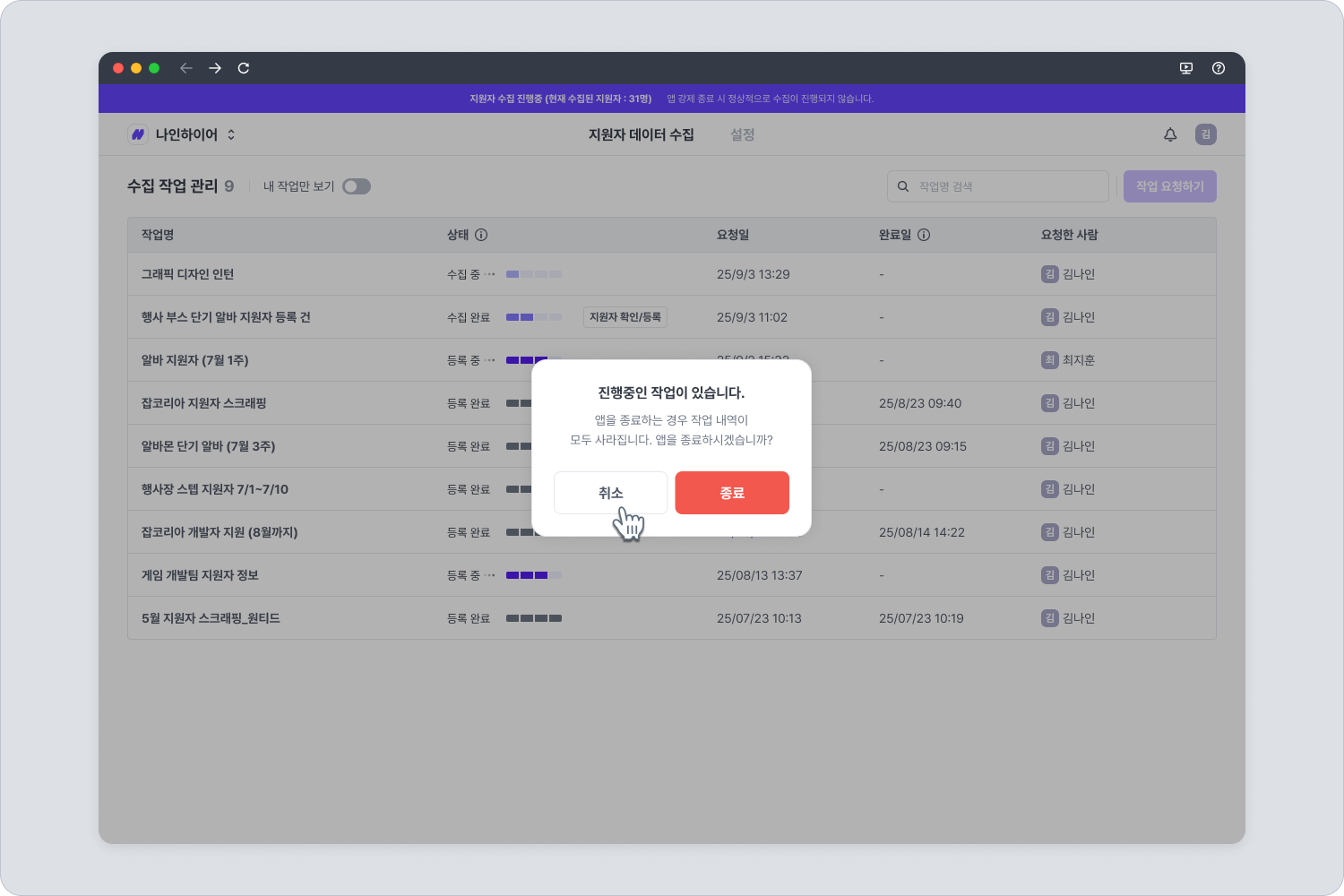 진행 중인 작업이 있는 상태에서 나인하이어 커넥트를 종료하게 되면 작업 내역이 모두 사라지므로 진행 중인 작업이 완료된 후 앱을 종료하는 것을 권장합니다.