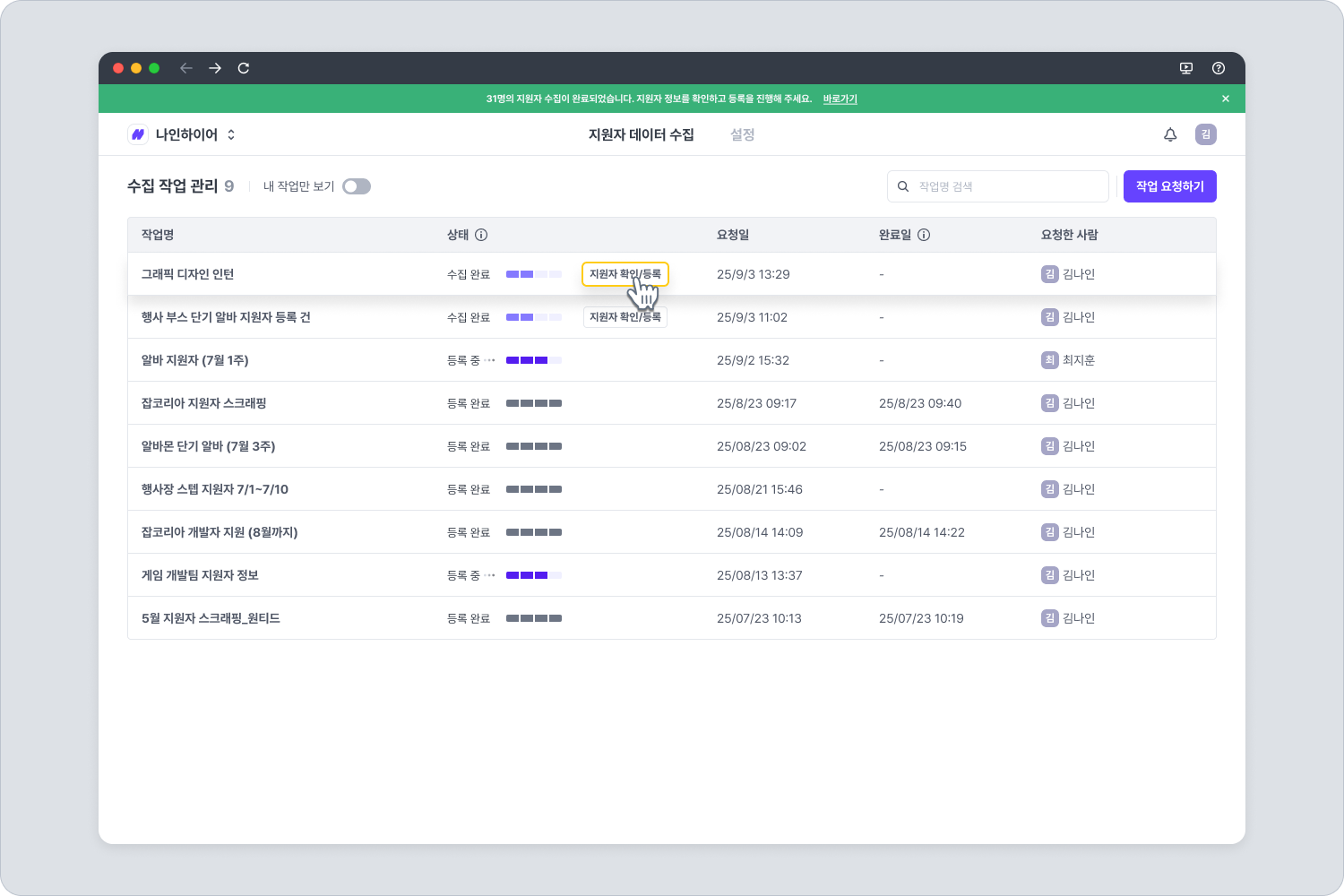 등록 완료: 매칭된 나인하이어의 채용에 등록이 완료된 상태입니다. 각 채용의 접수 단계에서 등록된 지원자를 확인할 수 있습니다.