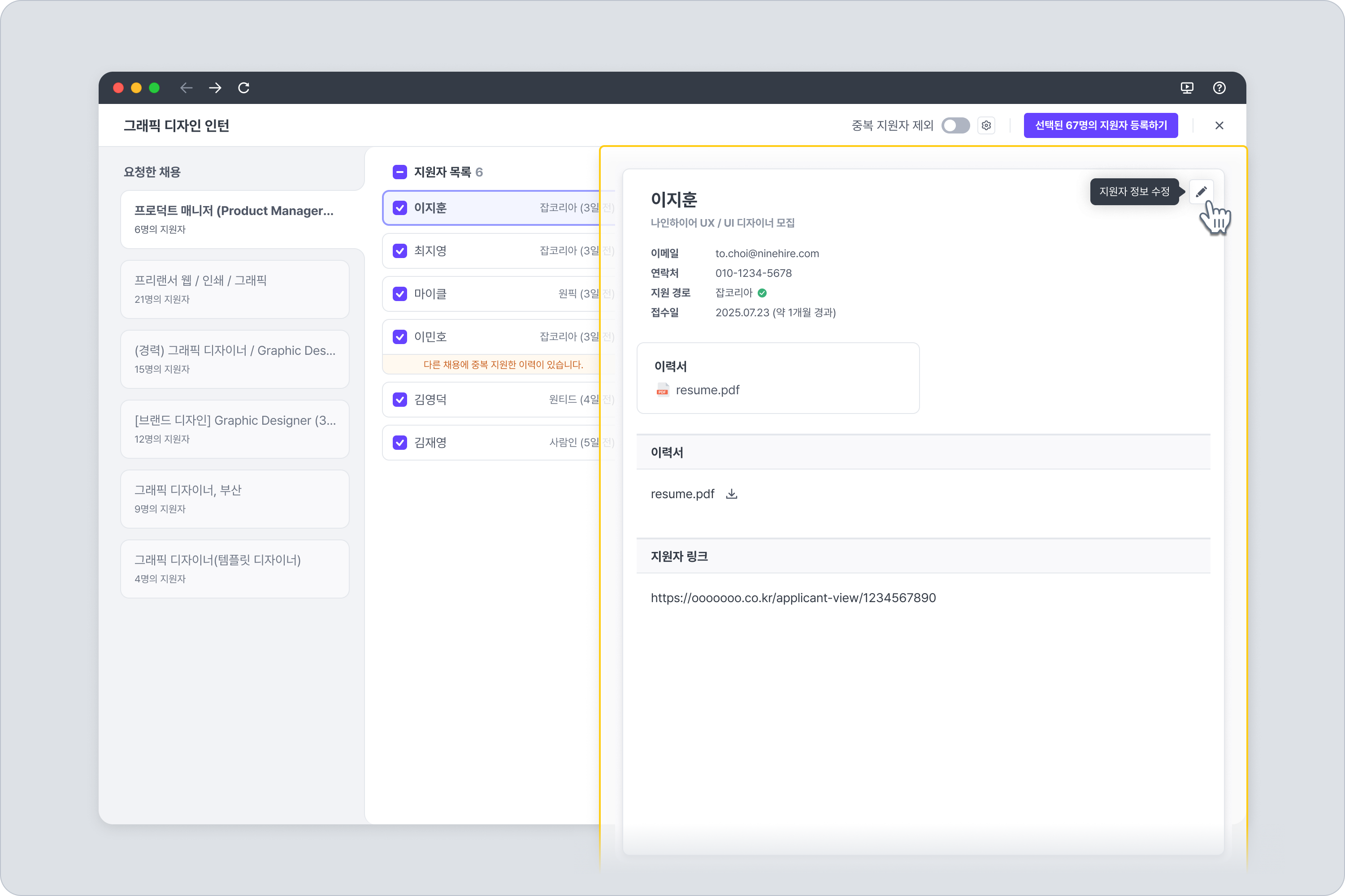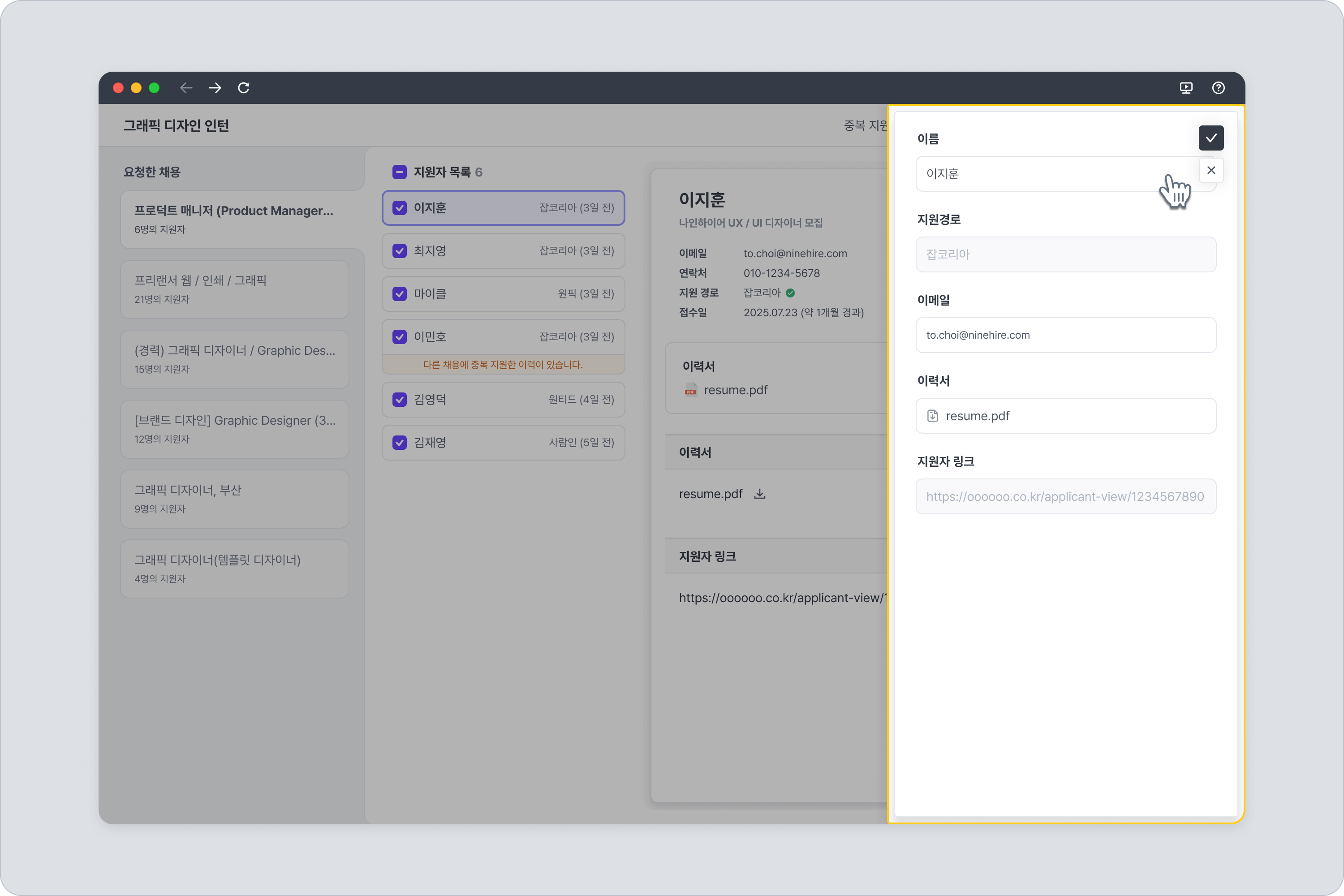 지원자는 나인하이어에 등록되므로 등록 후 플랫폼의 지원자 정보와 나인하이어의 지원자 정보를 대조하여 누락 혹은 오기입된 정보를 직접 수정하시면 됩니다.