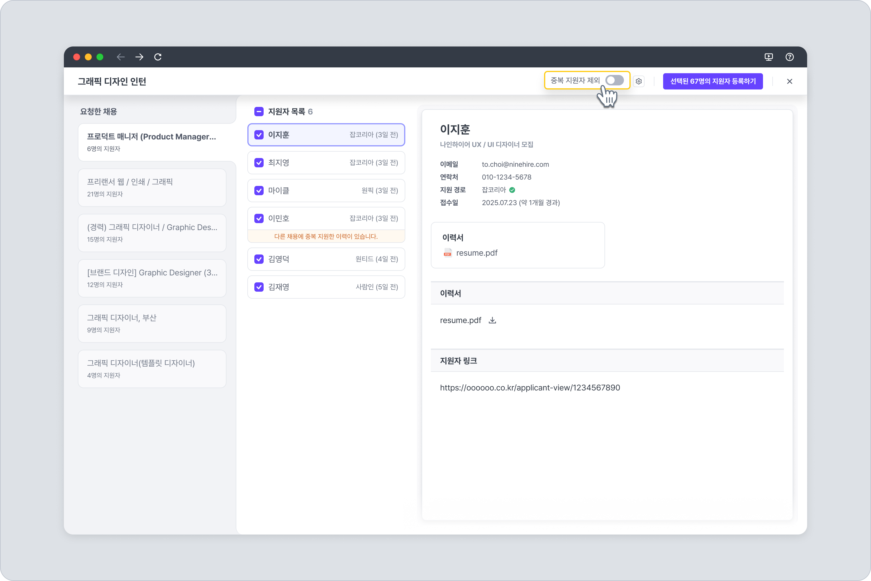 지원자 등록 화면 상단에 표시되는 [중복 지원자 제외] 버튼을 켜면 나인하이어에 이미 등록된 지원자를 추가로 등록하지 않도록 제외할 수 있습니다.