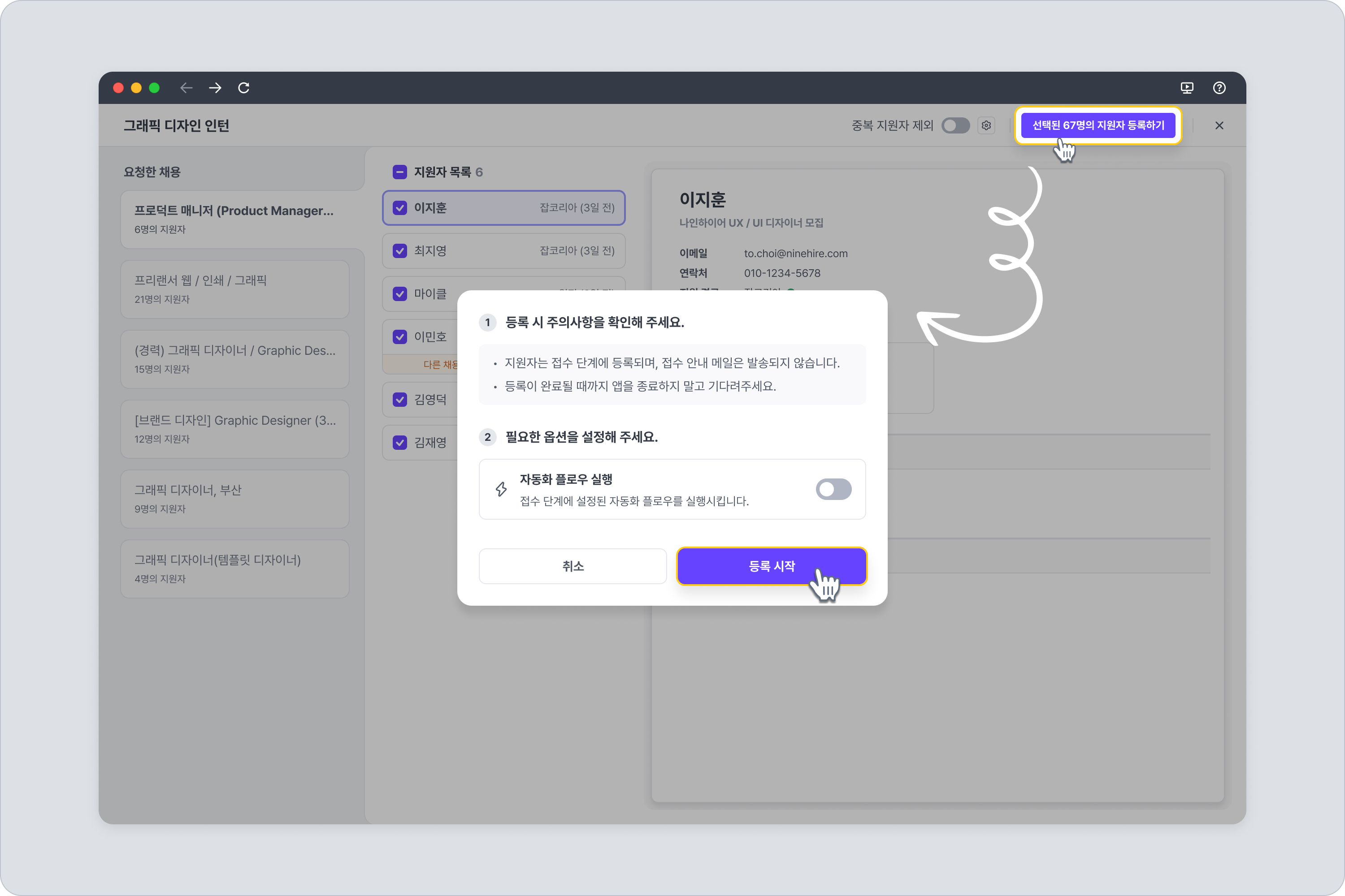 자동화 플로우 실행: 지원자를 등록하며 접수 단계에 설정된 자동화 플로우를 실행시킬 수 있습니다.