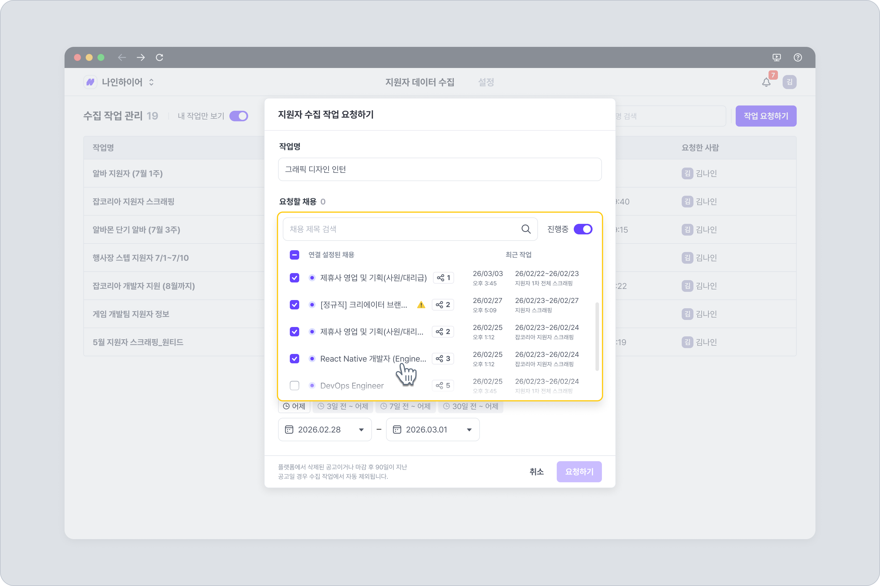 작업명을 입력한 후, 지원자를 수집할 채용을 선택합니다.