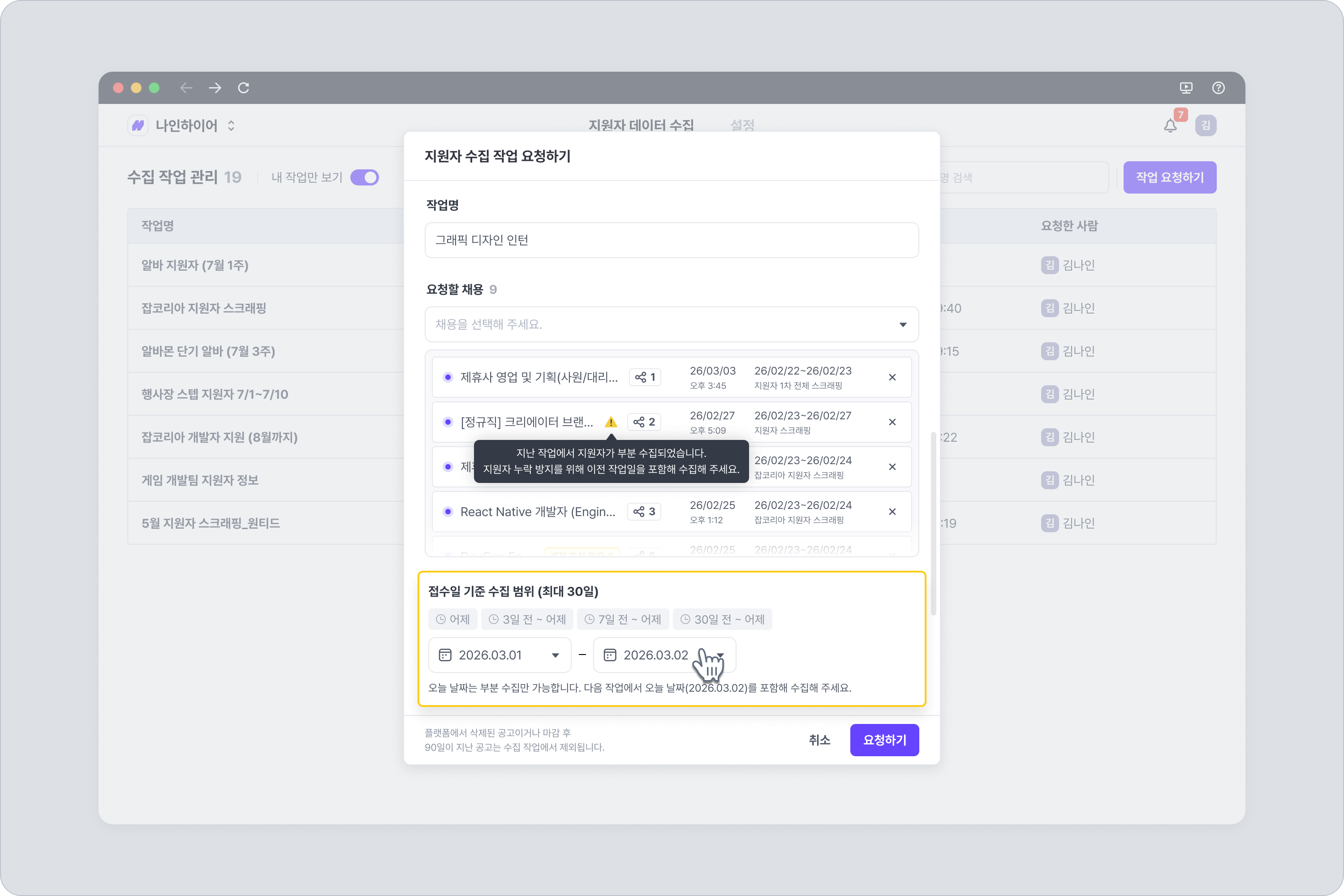 지난 수집 작업에서 수집 범위를 ‘오늘’로 설정했다면, 일부 지원자만 수집되었을 수 있습니다. 이 경우 지원자 등록 누락을 막기 위해, 이번 수집 범위에 지난 작업일을 포함하는 것을 권장합니다.
