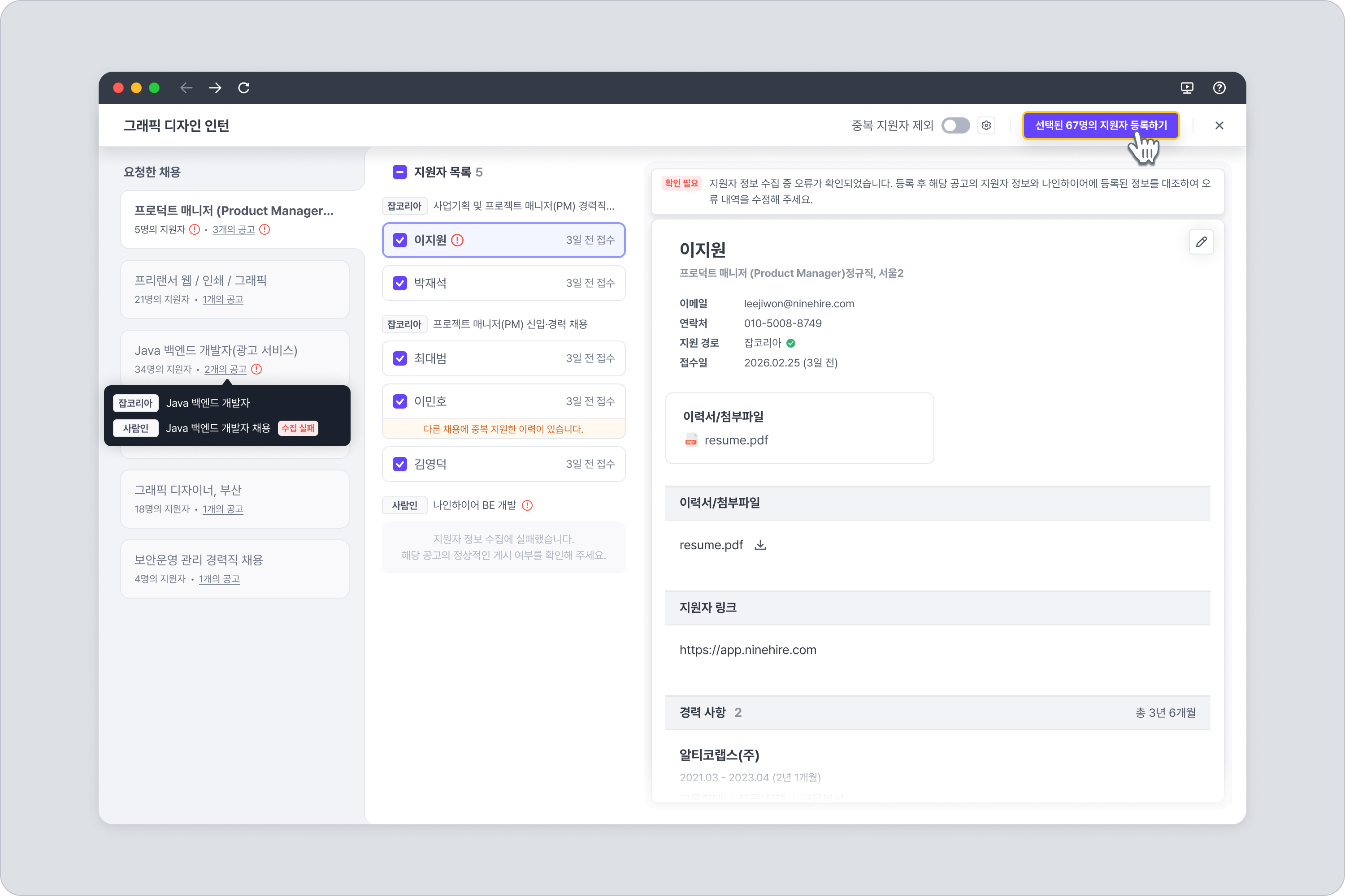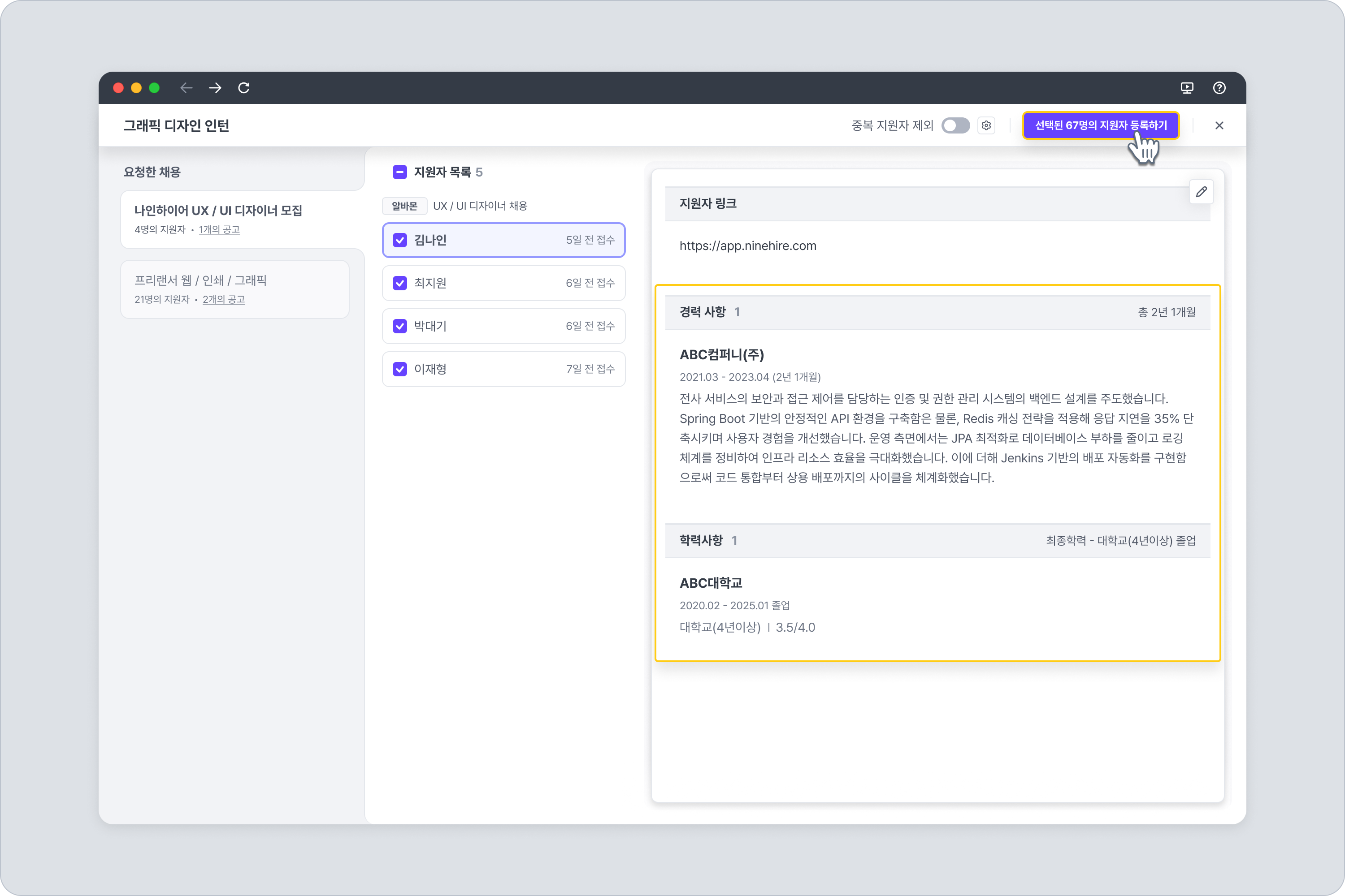 지원자 정보 수집 작업이 완료되었다면 나인하이어에 지원자를 등록할 수 있습니다.