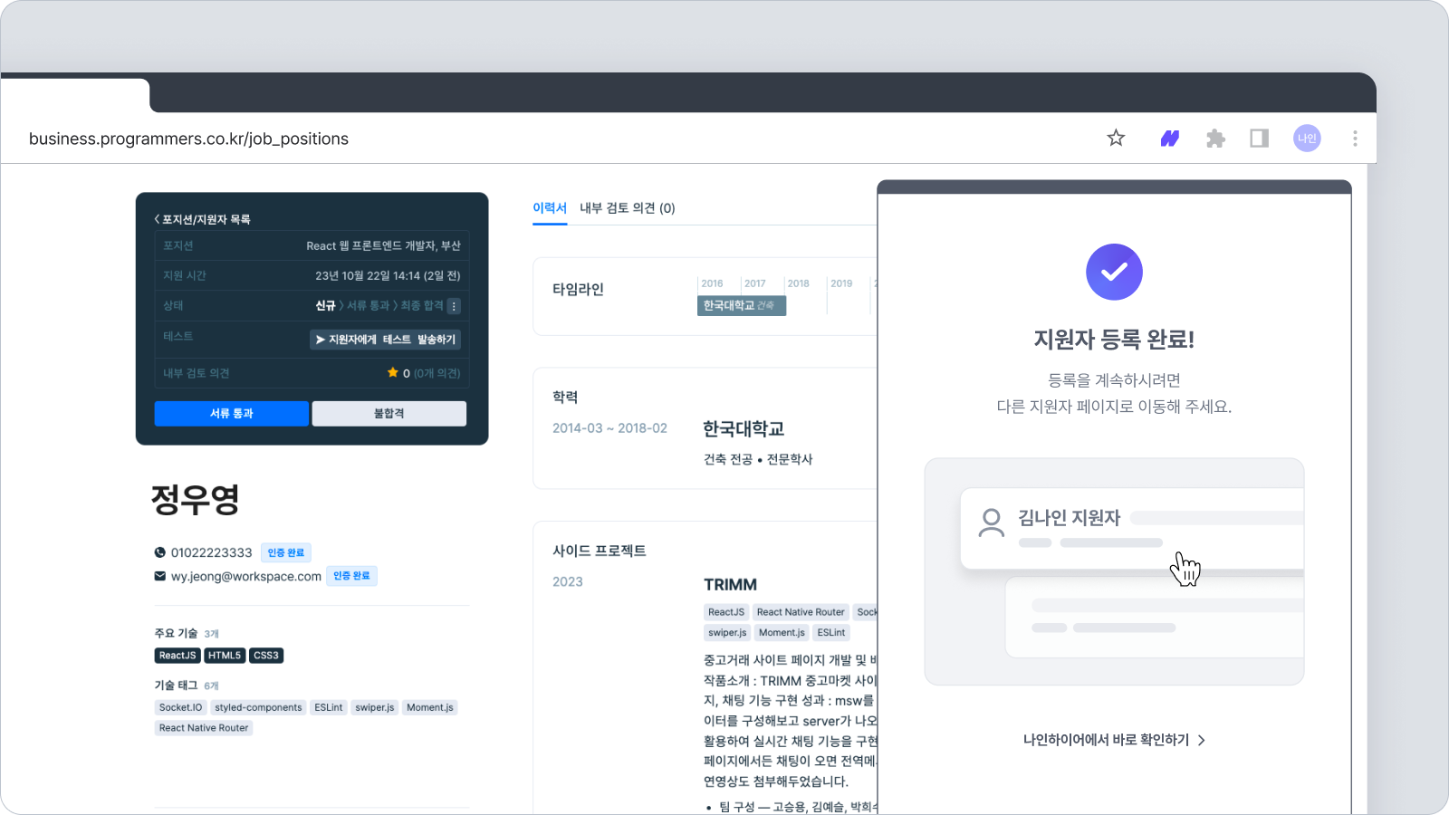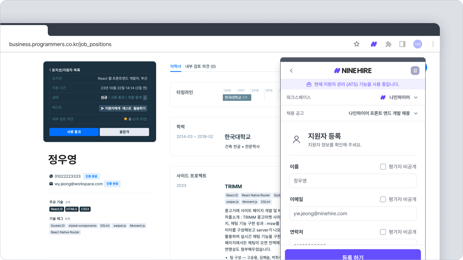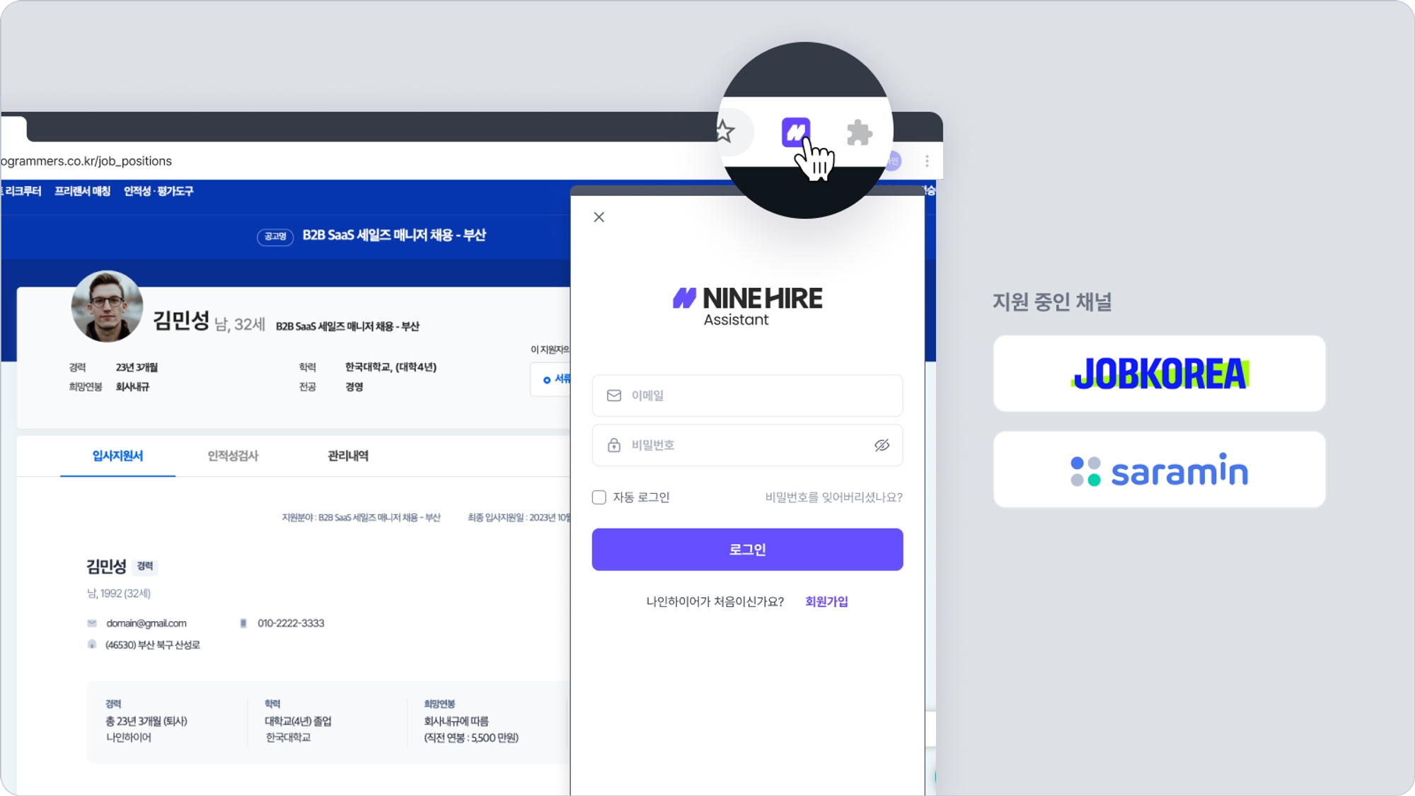 나인하이어 어시스턴트를 켠 상태에서 외부 채용 포털 내 지원자 정보를 열람하면 정보가 자동으로 기입되며, "등록하기" 클릭 한번으로 간편하게 지원자를 등록하게 됩니다. 상세한 설명은 아래에서 더 확인해 보세요.
