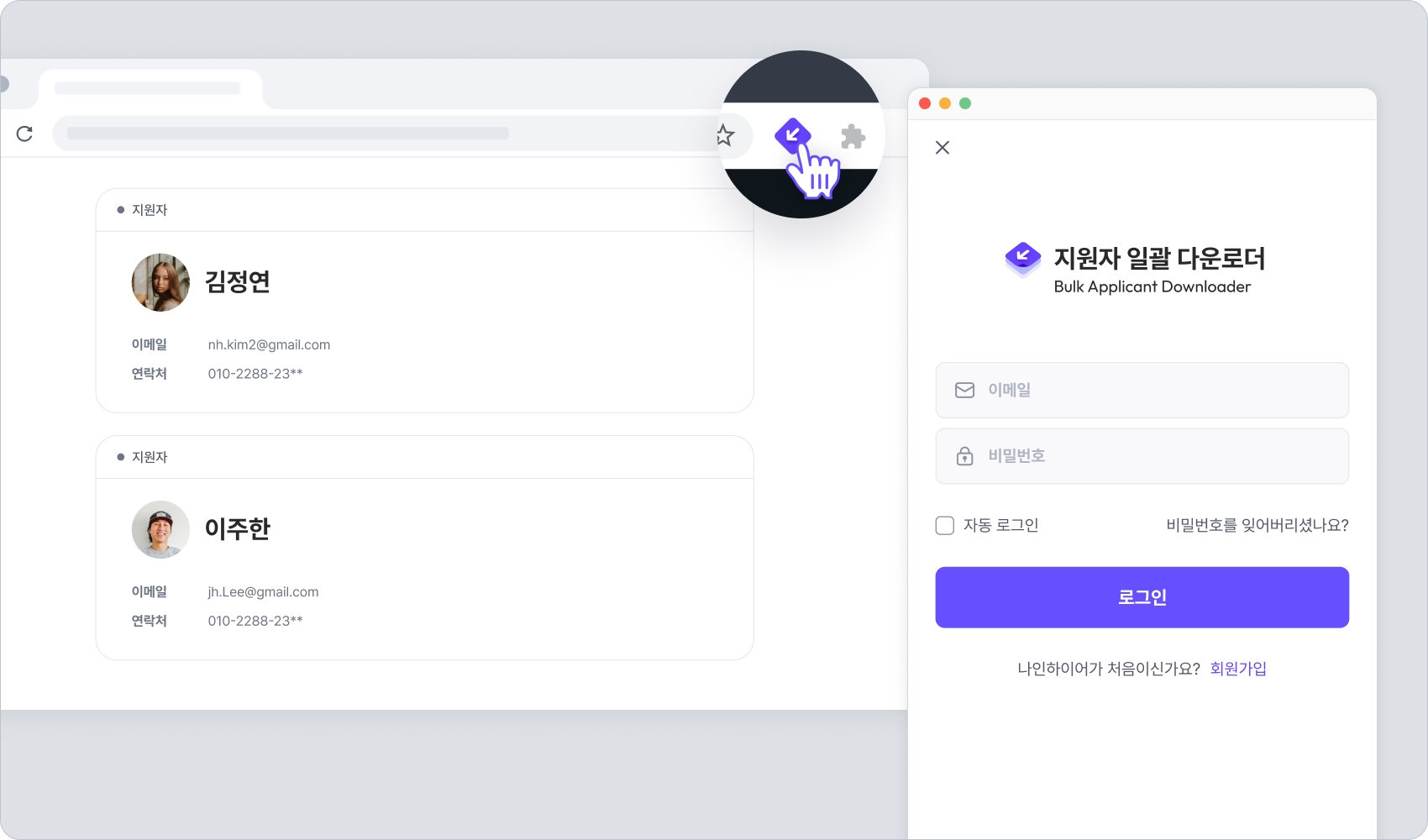 크롬 브라우저 우측 상단에 위치하고 있는 지원자 일괄 다운로더 아이콘을 클릭하여 프로그램을 실행시킵니다. 새 창에서 지원자 일괄 다운로더가 실행됩니다. 나인하이어 계정과 비밀번호를 입력하여 로그인합니다.