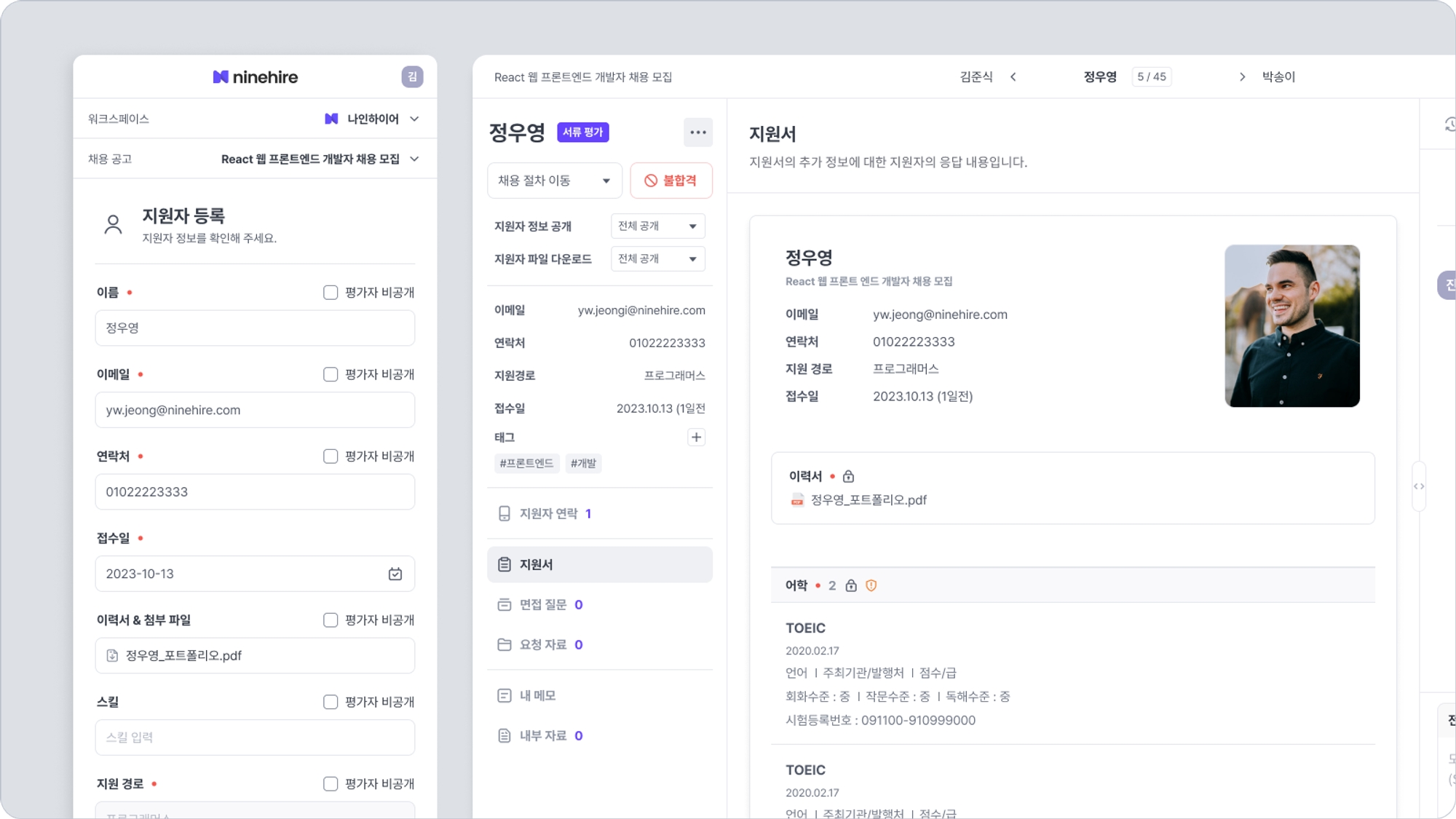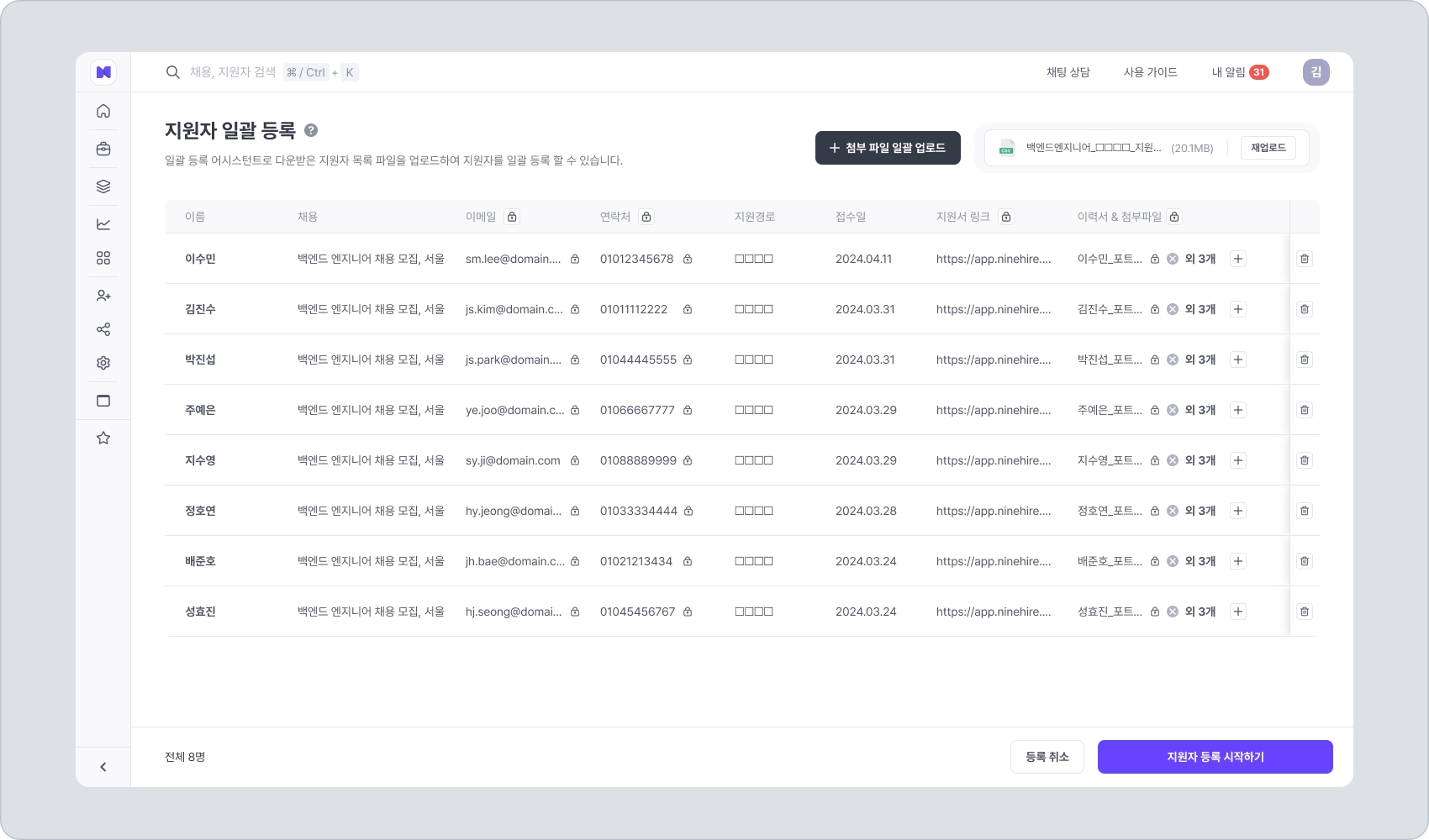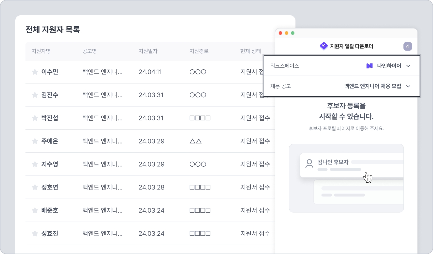 각 채용의 접수 단계에서 등록된 지원자들을 확인할 수 있습니다. 등록된 지원자들을 나인하이어에서 편리하게 열람하고 관리하세요.