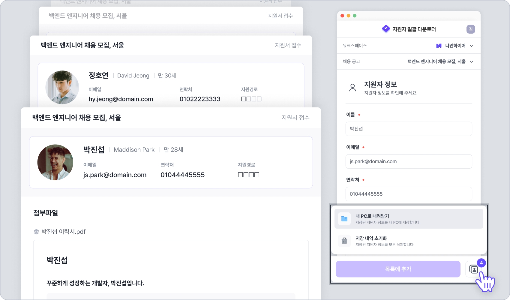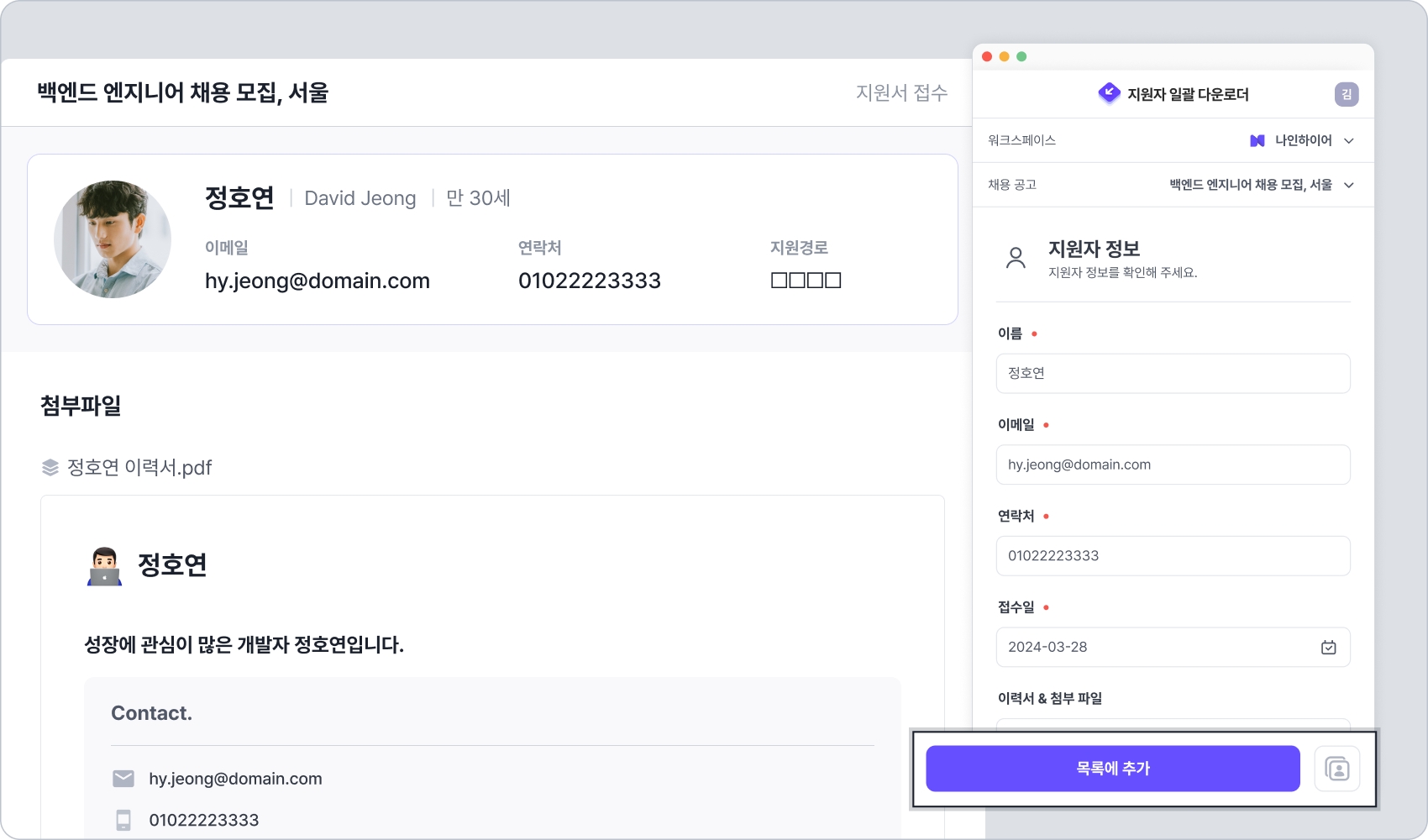 지원자의 상세 페이지 내에서 워크스페이스와 채용 공고를 선택하여 원하는 채용에 지원자 정보를 등록시킵니다. 지원자 일괄 다운로더의 정보 입력란이 자동으로 채워지면 [목록에 추가] 버튼을 클릭합니다. 지원자의 상세 페이지 내에서 동일한 과정을 진행하면, 다수의 지원자를 다운로더 목록에 추가할 수 있습니다.