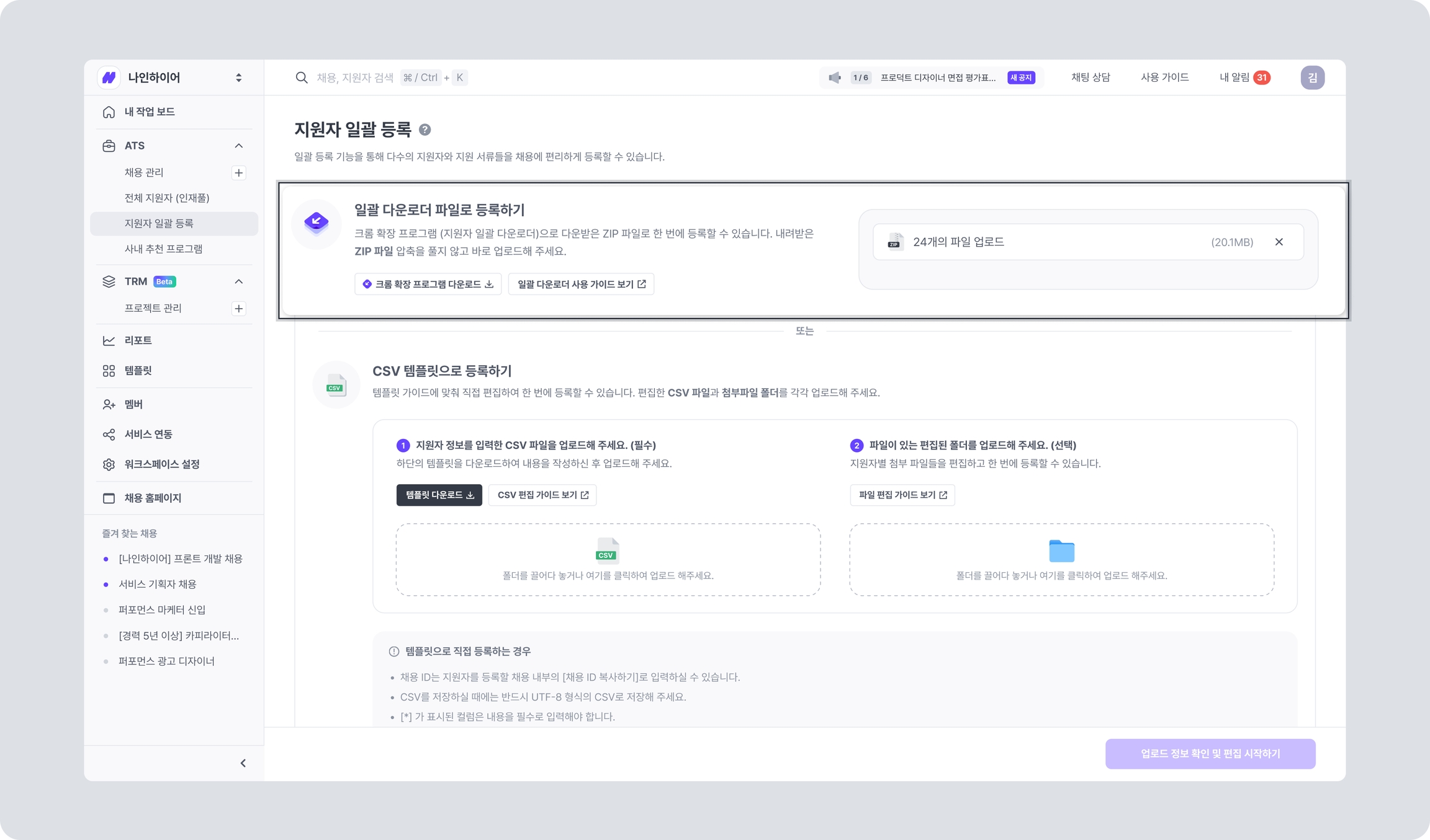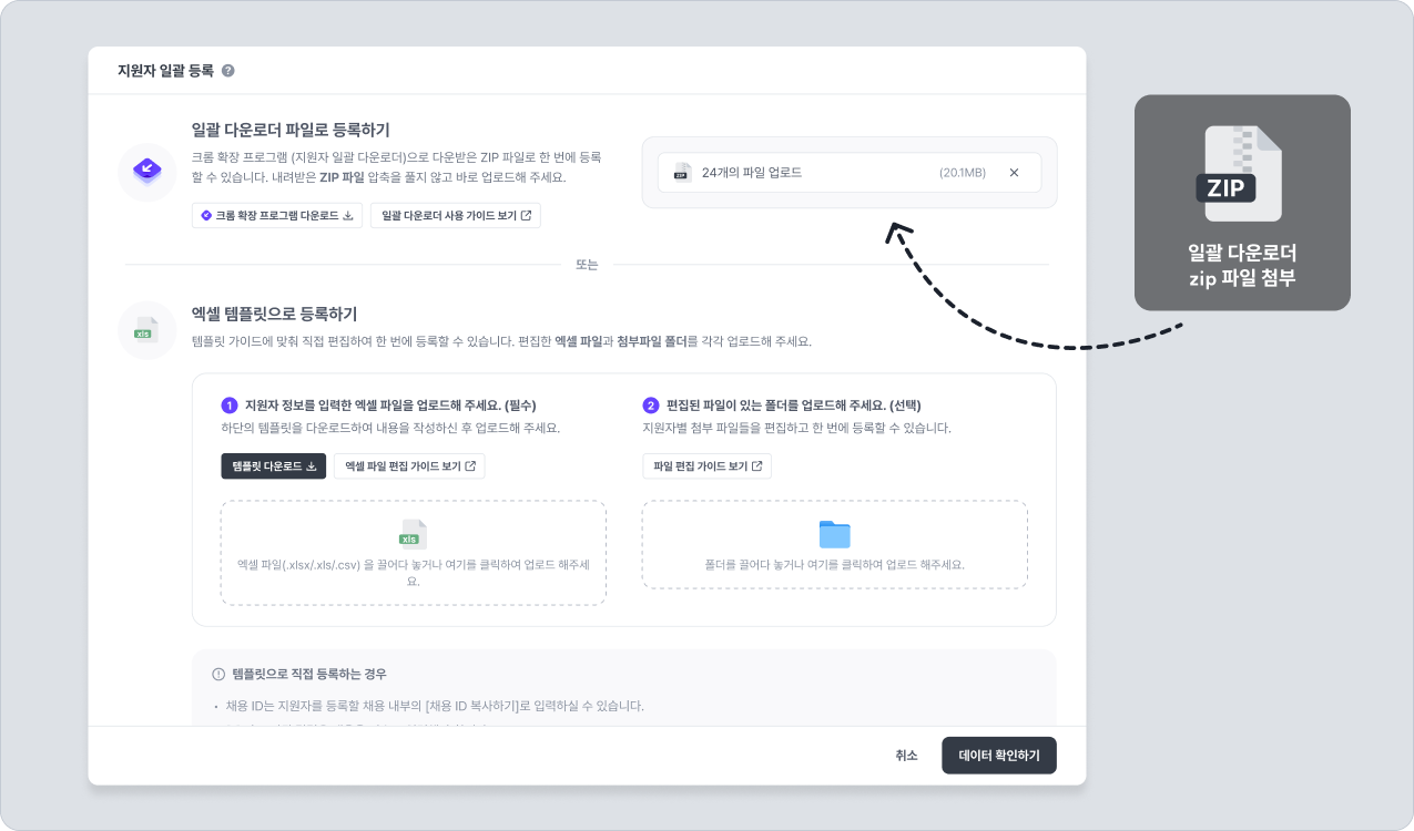 나인하이어 내에서 채용 관리 > 전체 지원자 > 지원자 데이터 관리 > 지원자 일괄 등록 > 일괄 다운로더 파일로 등록하기 경로로 이동합니다. 다운로드한 ZIP 파일을 압축 해제 과정 없이 그대로 업로드합니다.