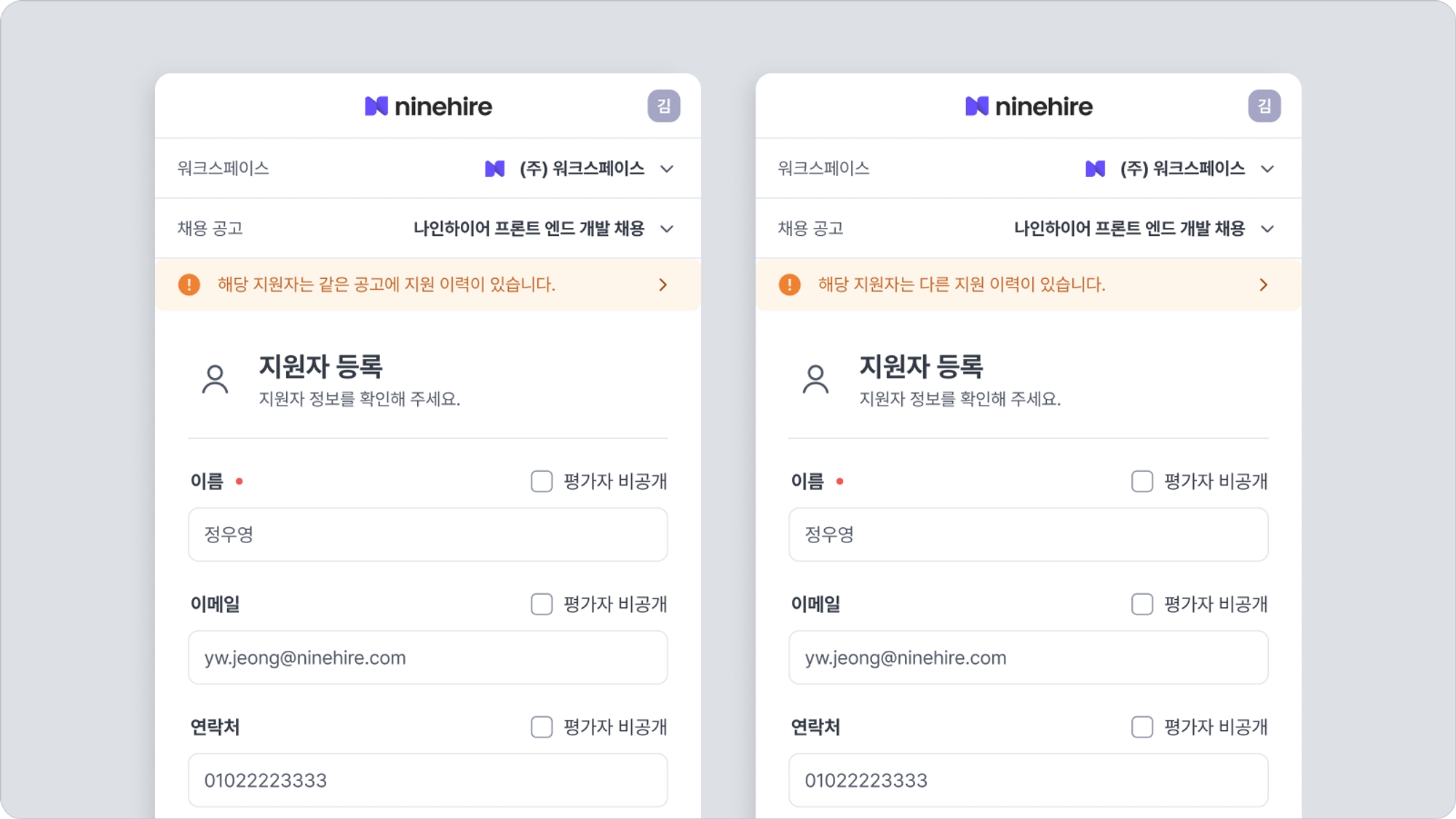나인하이어 어시스턴트에서는 중복 등록이나 중복 지원자의 경우 상단 안내를 통해 알림을 제공합니다. (일괄 다운로더에서는 중복 지원자 표시가 제공되지 않습니다.)