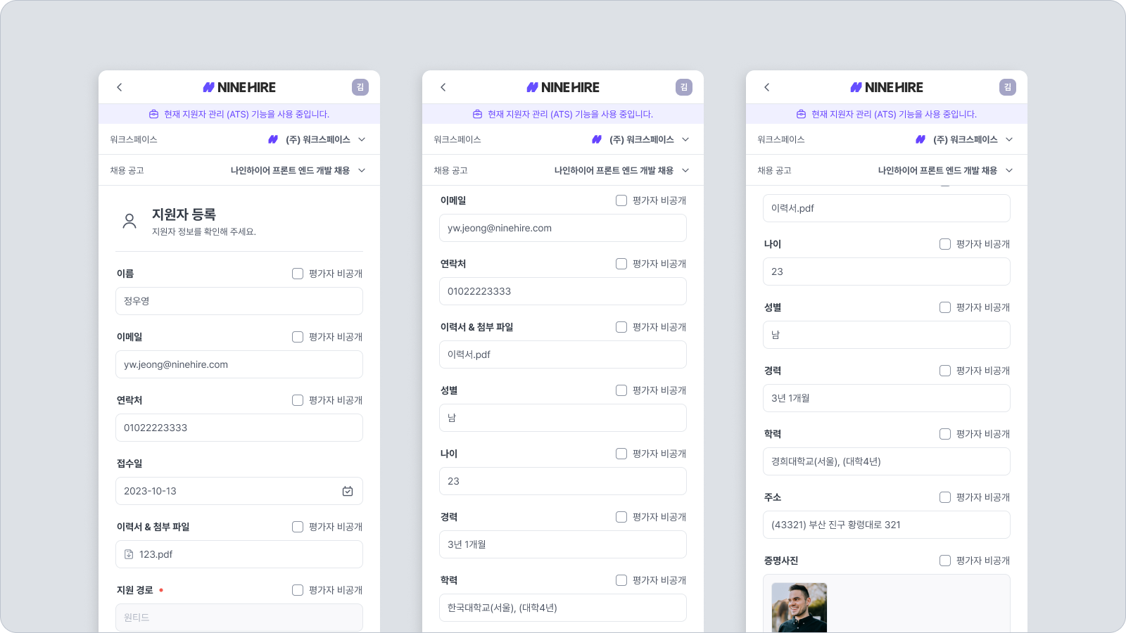 업로드된 지원자 정보와 첨부 파일을 확인할 수 있습니다. 또한, 각 항목의 열람 권한을 수정하거나 첨부 파일을 추가/제거할 수 있습니다.