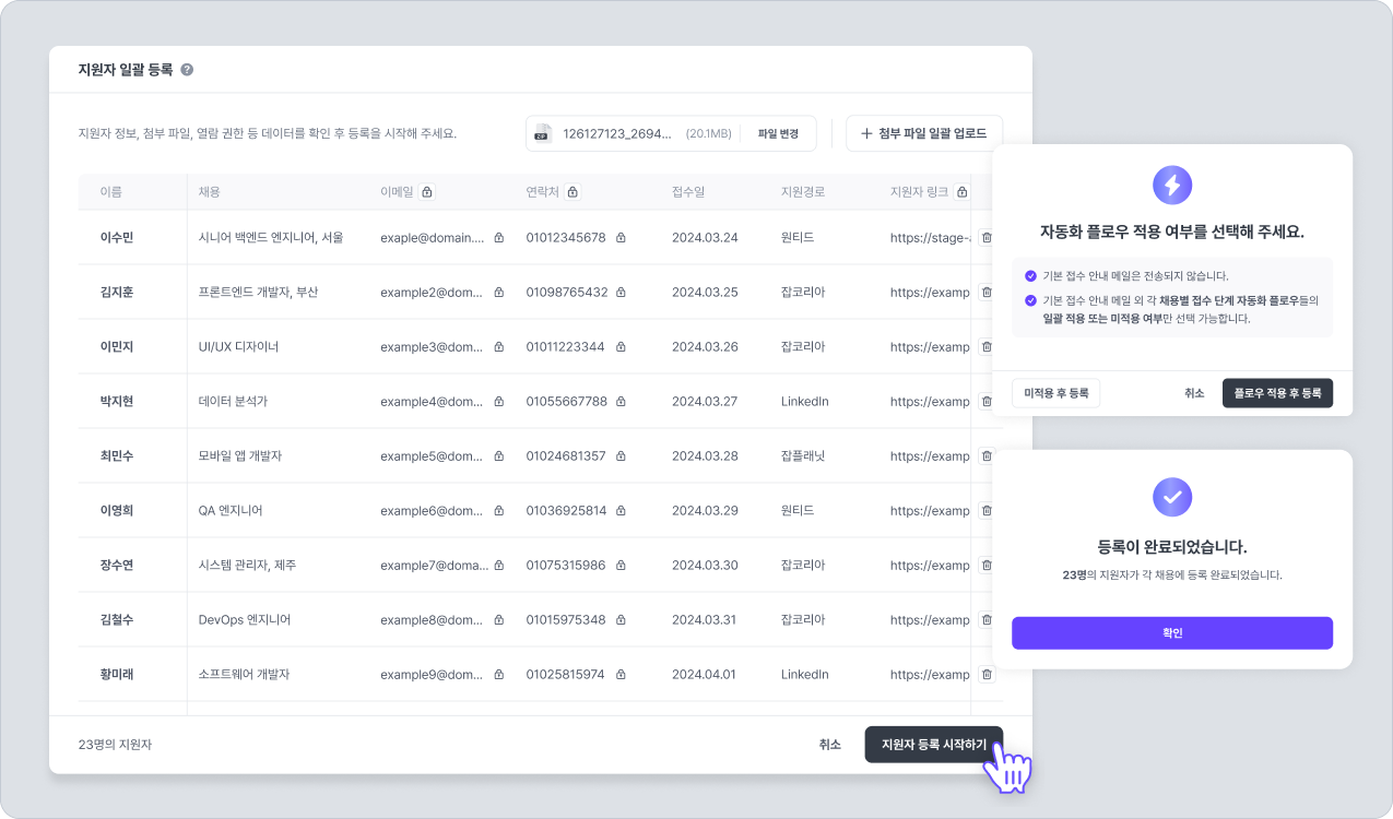 등록하기 버튼을 클릭하면 지원자 등록이 완료되었다는 안내가 표시됩니다.