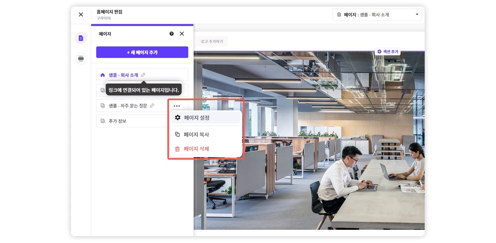 페이지 설정 버튼을 누르면 기본 설정, SEO 기본, SNS 설정 등을 추가/수정할 수 있습니다.