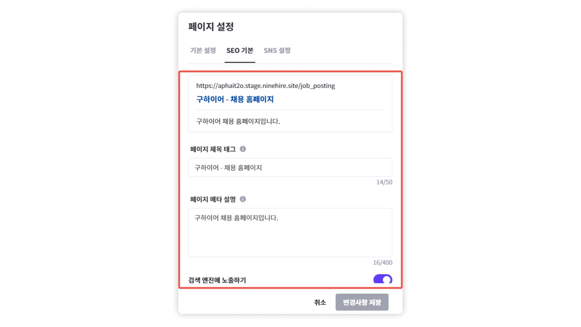 ◼ 경로: 채용 홈페이지 > 홈페이지 디자인 편집 > 페이지 설정 > SEO 설정 > 페이지 제목 태그