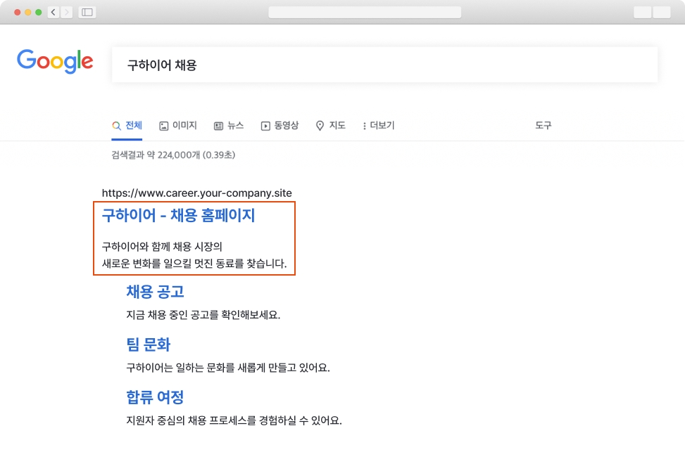 페이지 메타 설명 : 해당 페이지의 url이 검색 엔진 등에 노출될 때 표시될 페이지의 설명글을 입력합니다. 제목 태그와 마찬가지로 핵심키워드인 회사명, 채용, 페이지별 키워드 등을 가장 먼저 노출시킨 뒤 필요한 설명을 추가하는 것을 추천합니다.