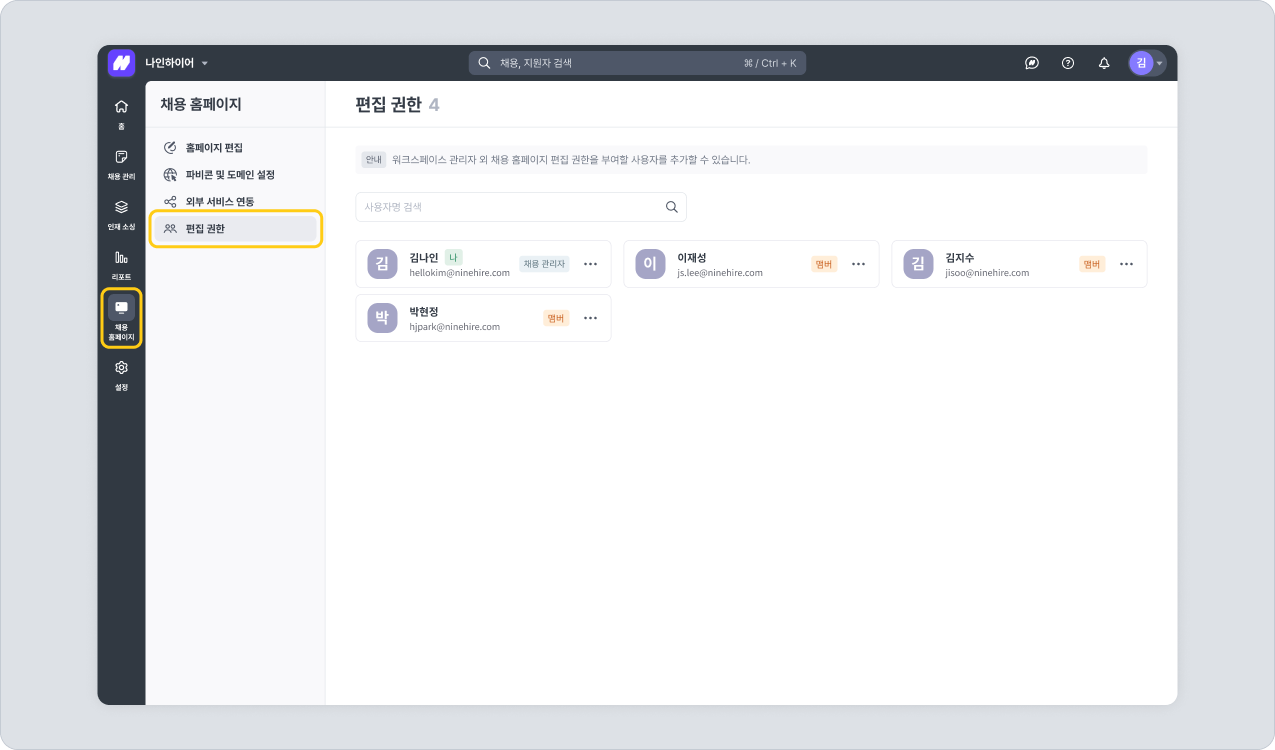 채용 홈페이지 편집은 기본적으로 워크스페이스 관리자만 가능합니다. 그러나 권한에 관계 없이 특정 사용자를 편집 사용자로 지정할 수 있습니다.