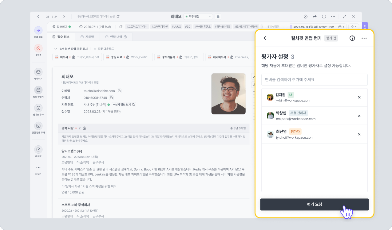 평가 요청을 누르면 해당 평가의 상태는 '평가중'으로 변경되며, 설정된 평가자들에게 평가 시작 알림이 전송됩니다.