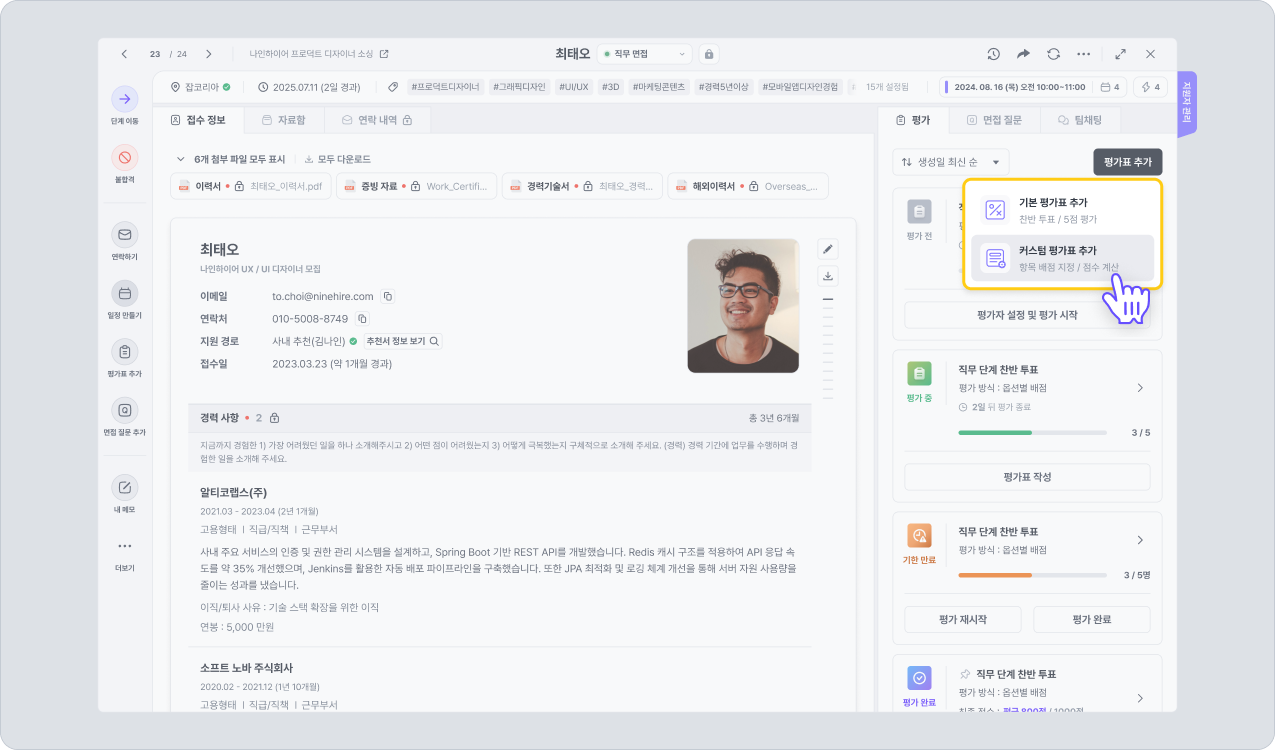 지원자 상세 화면 우측 사이드 > [평가] 탭의 아래에 있는 [평가표 추가] 버튼을 클릭 후, [커스텀 평가표 추가] 버튼을 클릭합니다.